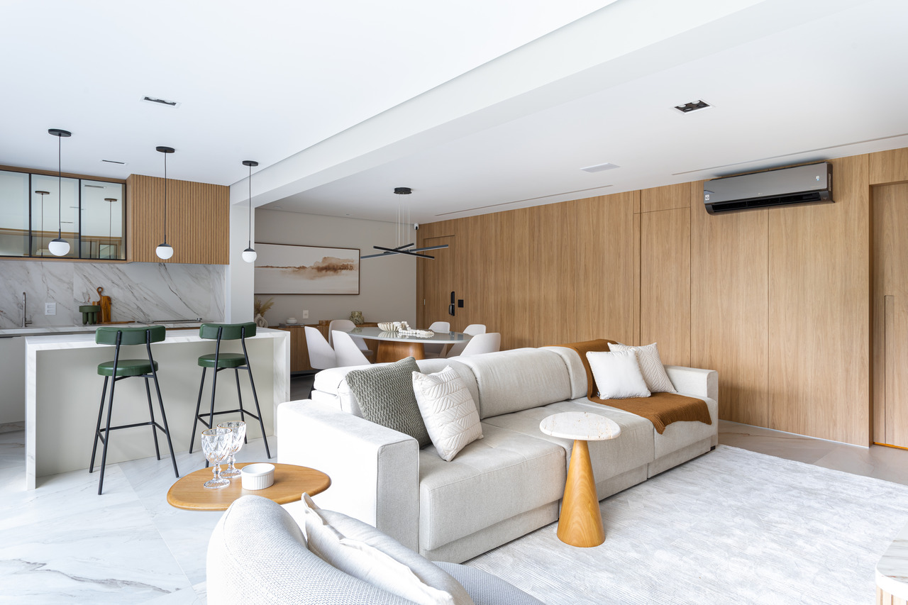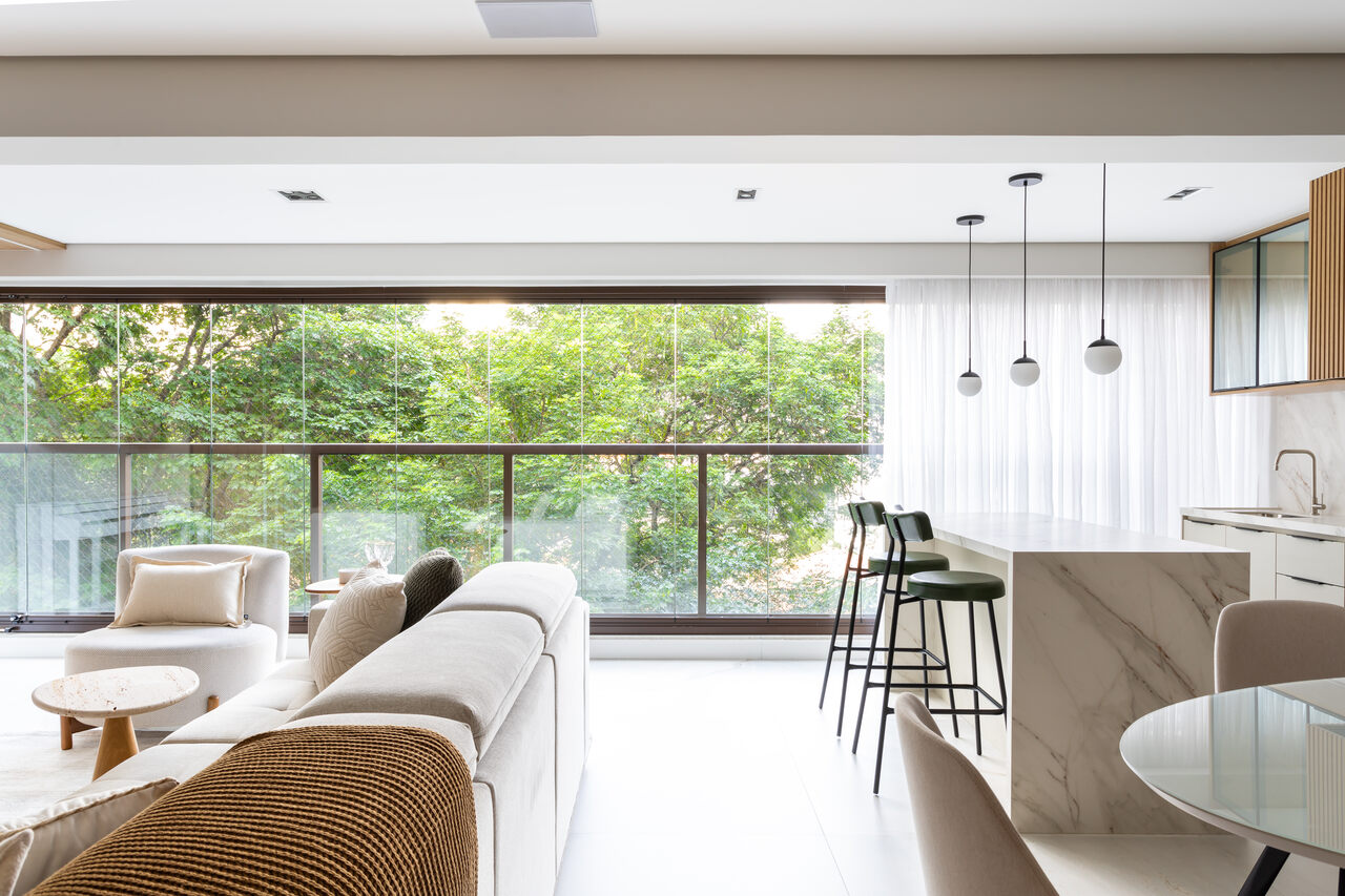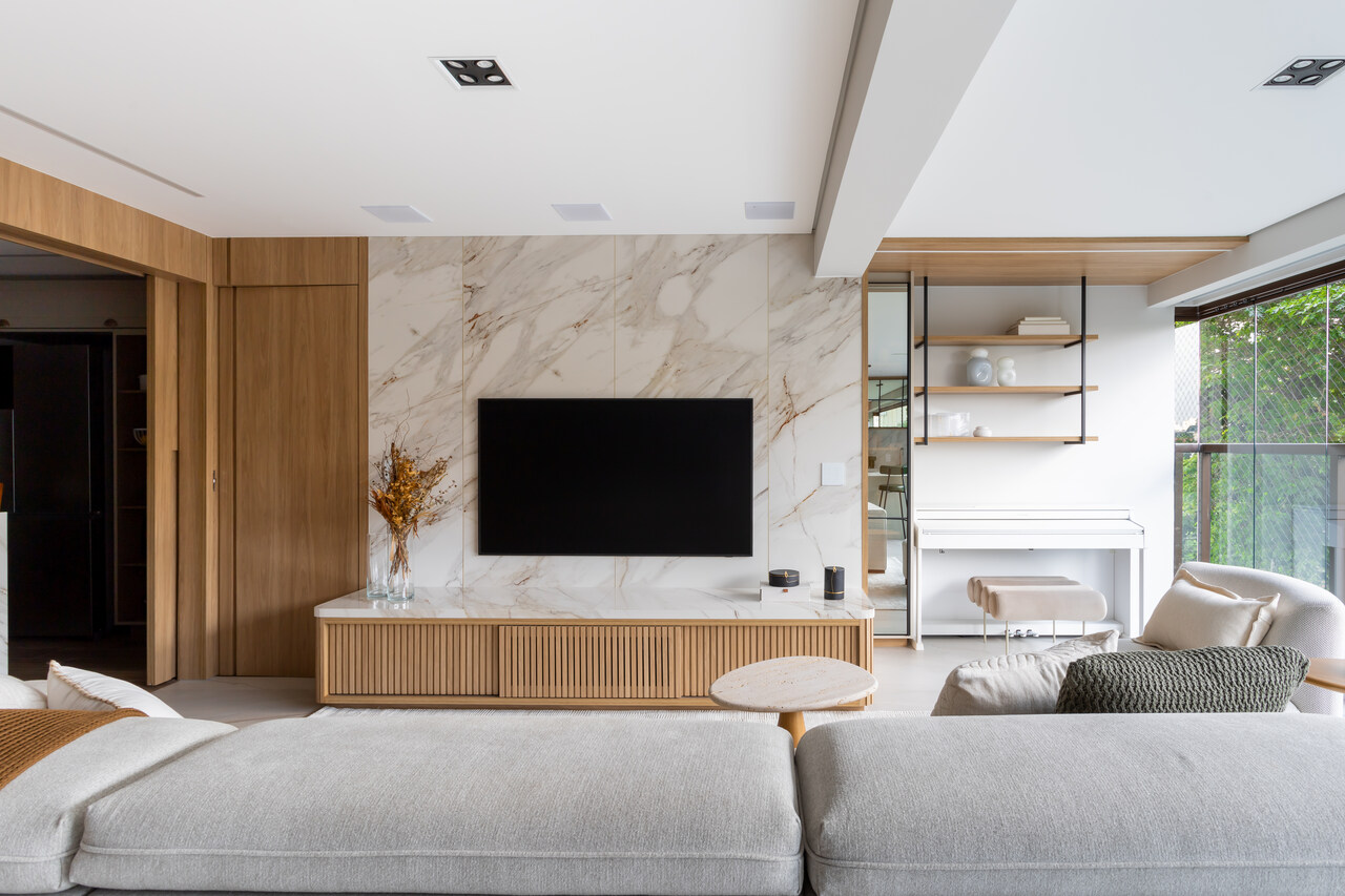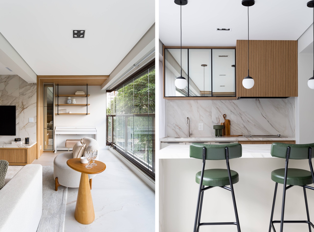 Na reforma, ela conta que promoveu o nivelamento do piso da área social que abarcou uma ilha para a área gourmet com churrasqueira a gás. A percepção refinada do efeito marmorizado torna-se evidente no painel da TV e na base superior do rack de madeira. Todos esses elementos citados pela arquiteta ganham um novo contorno quando são iluminados pela abundante luz natural que adentra através do generoso fechamento de vidro que premia o apartamento com a vista para o verde das copas da árvore existentes na rua, uma vez que não está em um andar muito elevado.