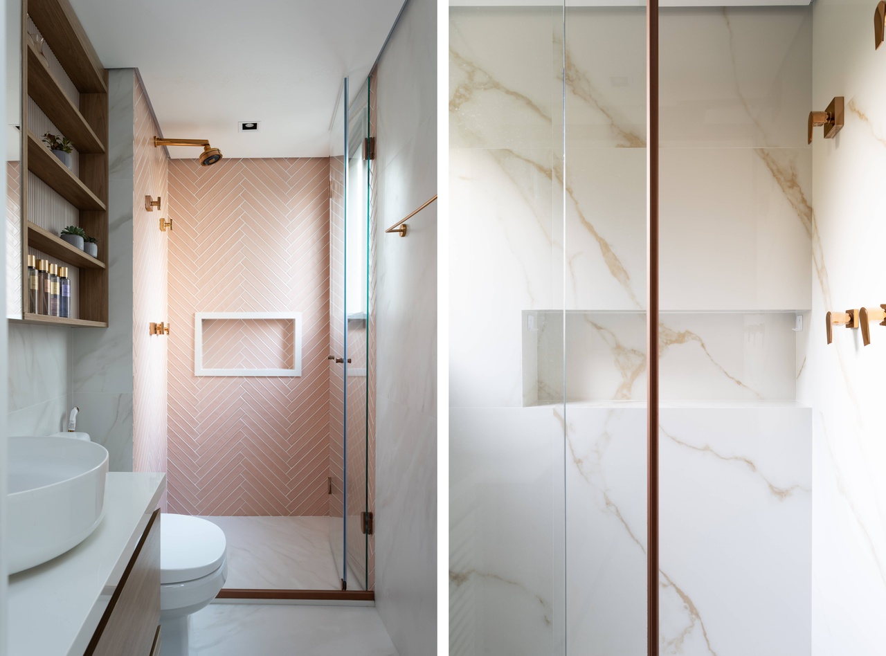 Para os banheiros do apartamento, a estética clássica se manteve evidenciada através do dourado nos metais, incluindo a ducha e caixilhos do box, bem como o marmorizado que revestiu as paredes e pisos.