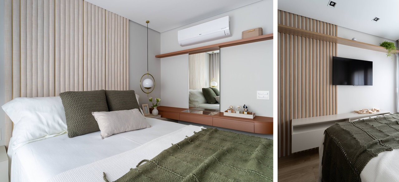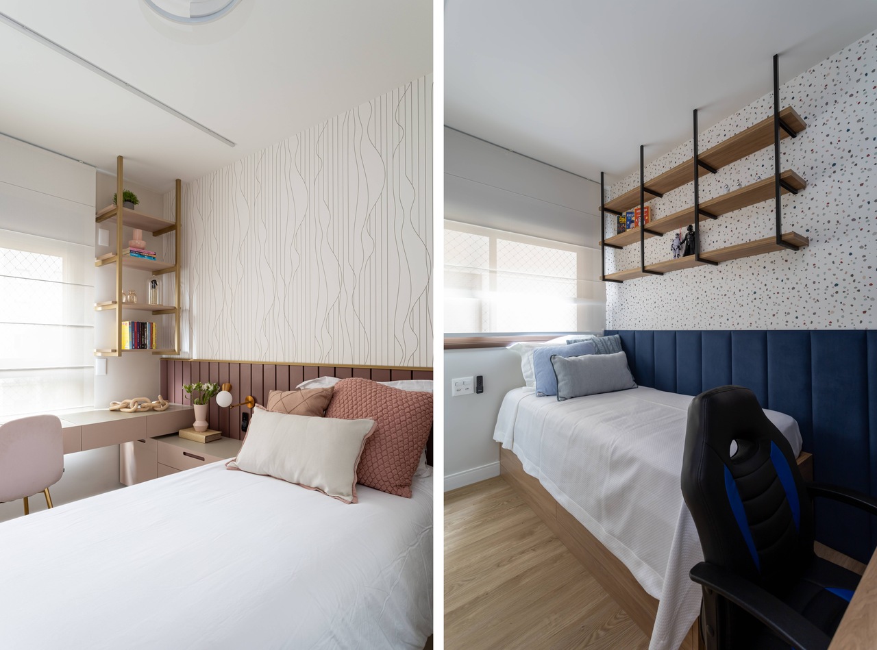 Nos dormitórios, Mari considerou a identidade de cada um dos membros da família. “Para a suíte do casal, por exemplo, diminuímos o espaço da sala para aumentar o closet que conta com armários e uma área generosa para sapatos e bolsas”, descreve ela sobre uma das primeiras adaptações que executou no cômodo.
