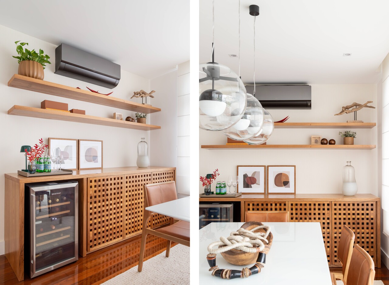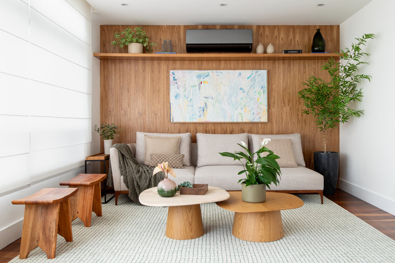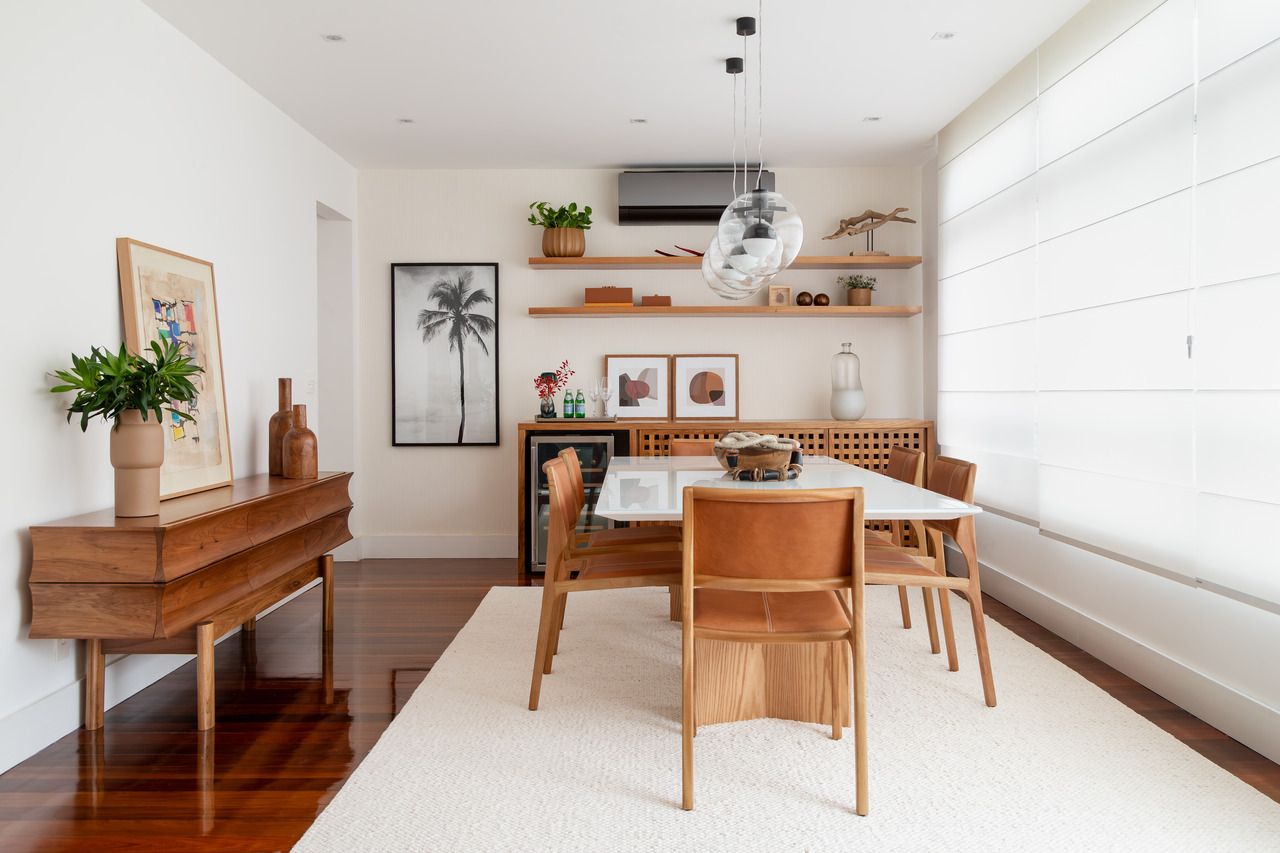 A escolha dos materiais contribui diretamente para a atmosfera aconchegante do apartamento. A madeira natural aparece nos móveis planejados revestidos com lâmina de freijó, enquanto o piso original em tábua corrida de ipê foi mantido e recebeu acabamento em Synteko polido. Para equilibrar o brilho, tapetes foram incorporados, adicionando textura e conforto aos ambientes.