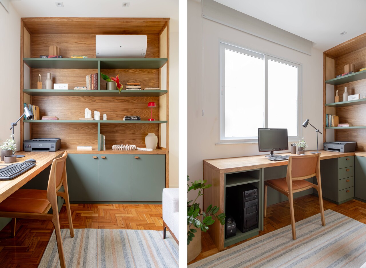 O home office foi um dos focos centrais do projeto. Pensado para unir design e praticidade, o ambiente se tornou tão agradável que levou à criação de um segundo espaço multifuncional, que também funciona como quarto de hóspedes. A proposta reforça a flexibilidade do apartamento e a adaptação à rotina contemporânea.