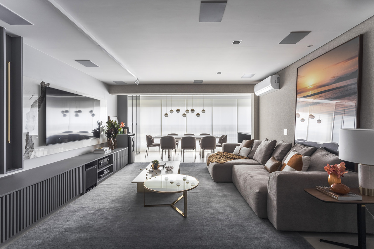 A configuração original do imóvel manteve a cozinha independente, respeitando a preferência do casal, mas sem perder a integração visual com os demais espaços. Para isso, foram projetadas portas deslizantes em muxarabi, que ocultam a cozinha quando necessário sem comprometer a entrada de luz natural. Posicionar a sala de jantar junto ao terraço foi uma solução estratégica, facilitando o fluxo e permitindo uma transição mais orgânica entre os ambientes. Esse deslocamento garantiu maior amplitude ao living, onde o home theater se tornou o grande protagonista, acompanhado de um sofá espaçoso, poltronas e uma mesa de centro, compondo uma atmosfera acolhedora.