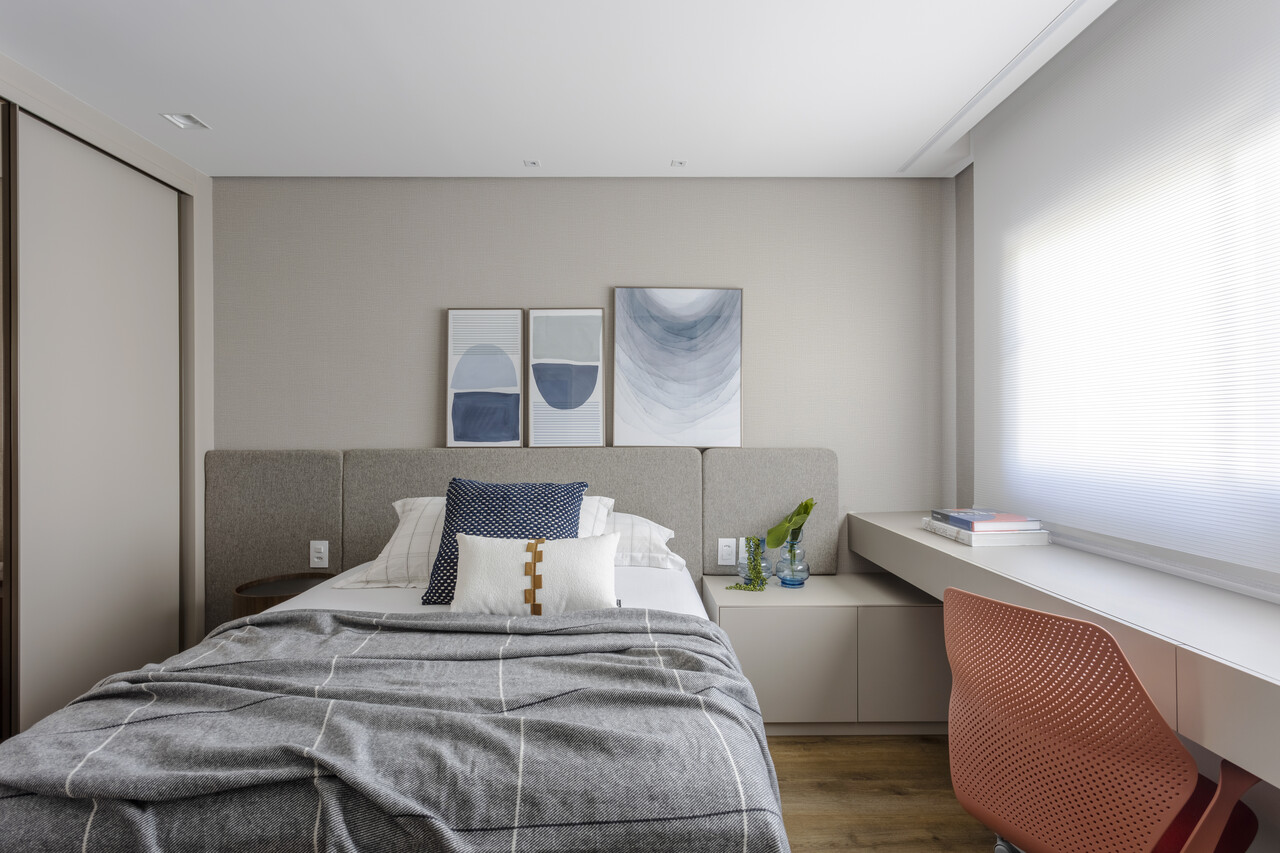 O apartamento conta com três suítes, sendo uma delas planejada para acomodar hóspedes e funcionar como home officepara a esposa, que trabalha remotamente com frequência. O ambiente foi pensado para atender às demandas do dia a dia, com uma bancada espaçosa e iluminação natural abundante. Além disso, a presença de uma cama de casal, armários amplos e TV garantiu que o espaço também se tornasse aconchegante para receber visitas.