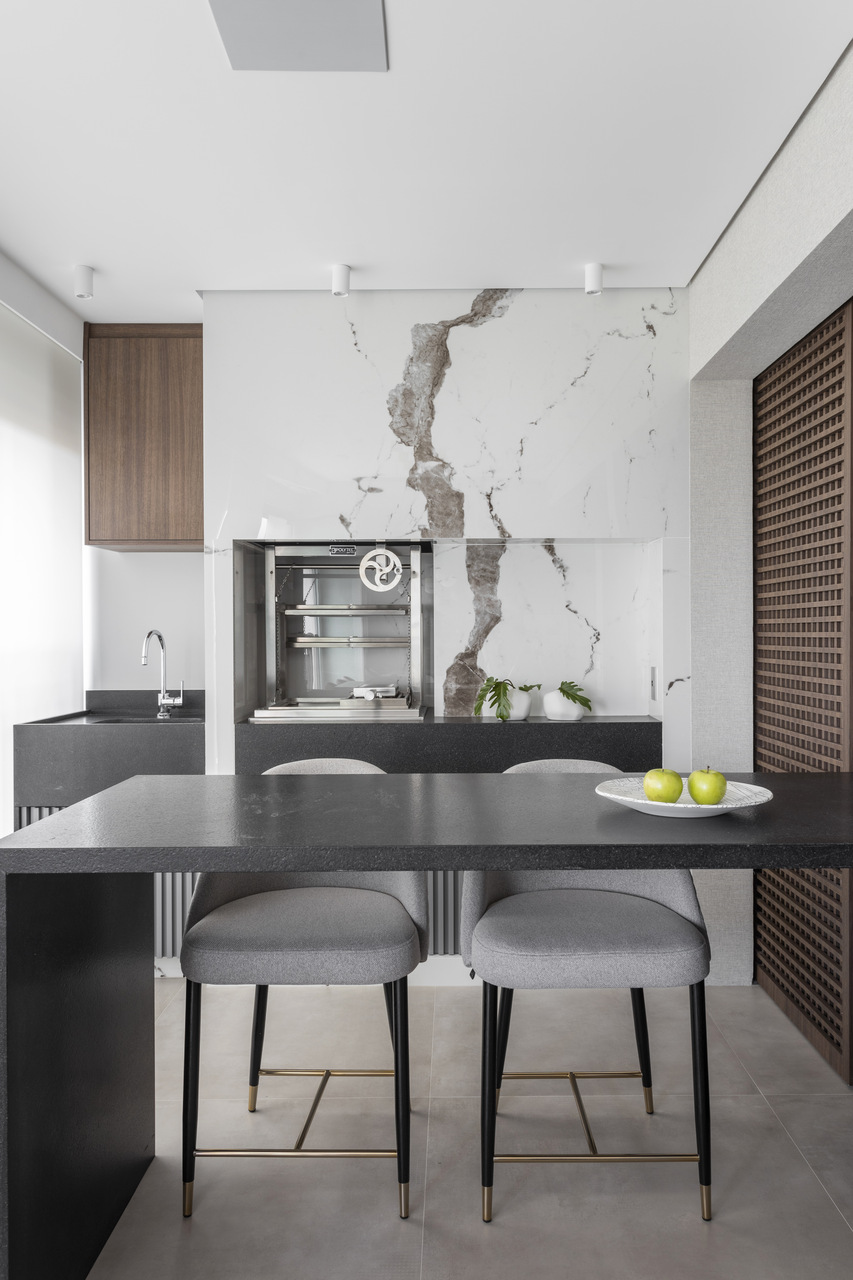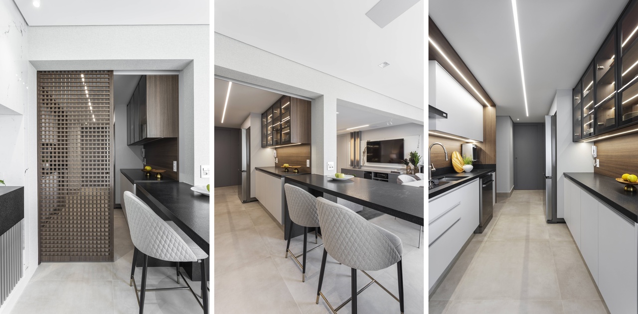 Com um projeto que equilibra linhas retas, materiais sofisticados e soluções funcionais, Daiane Antinolfi criou um projeto que reflete a personalidade do casal: um empresário de perfil reservado, porém aberto a novidades, e sua esposa, gerente de RH, expansiva e prática. A integração entre living, terraço e cozinha garantiu fluidez sem abrir mão da delimitação de cada ambiente, provando que funcionalidade e sofisticação podem caminhar lado a lado.