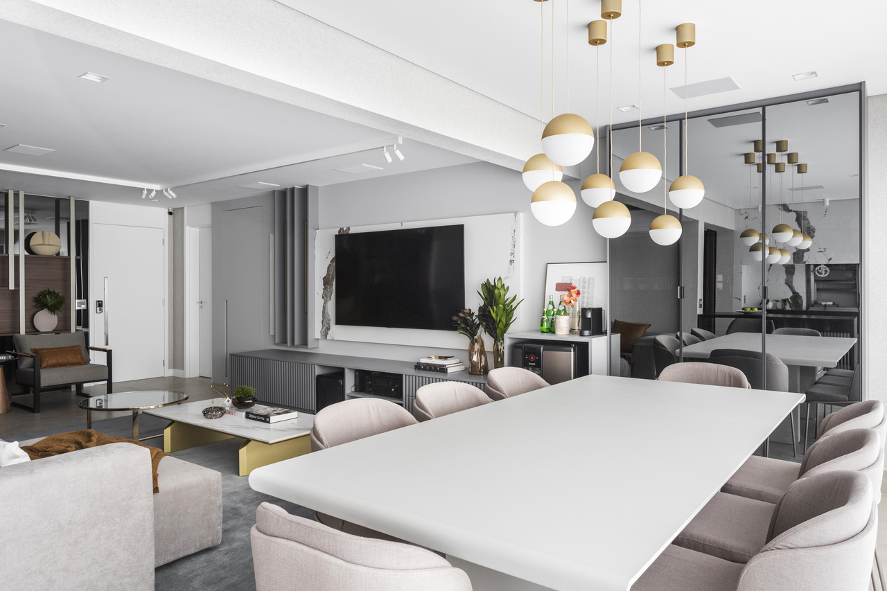 A configuração original do imóvel manteve a cozinha independente, respeitando a preferência do casal, mas sem perder a integração visual com os demais espaços. Para isso, foram projetadas portas deslizantes em muxarabi, que ocultam a cozinha quando necessário sem comprometer a entrada de luz natural. Posicionar a sala de jantar junto ao terraço foi uma solução estratégica, facilitando o fluxo e permitindo uma transição mais orgânica entre os ambientes. Esse deslocamento garantiu maior amplitude ao living, onde o home theater se tornou o grande protagonista, acompanhado de um sofá espaçoso, poltronas e uma mesa de centro, compondo uma atmosfera acolhedora.