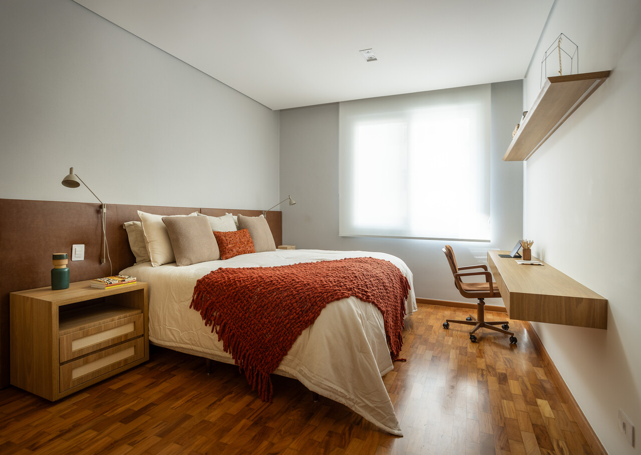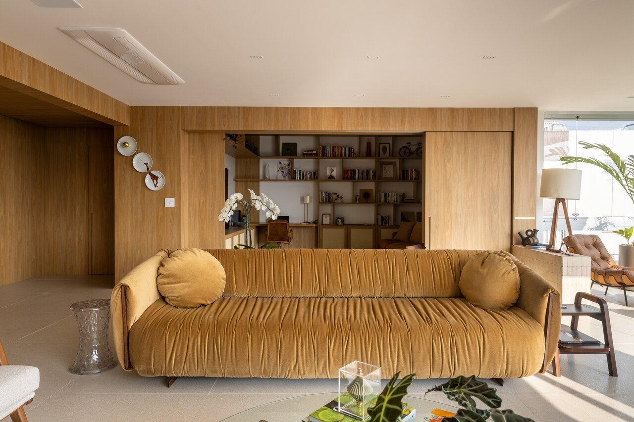 O mobiliário também dialoga com a linguagem contemporânea do projeto. Na sala, os sofás da Estar Móveis e do Atelier Gustavo Bittencourt completam a composição. Nos quartos, a restauração do piso de madeira original preserva a memória afetiva do imóvel e acrescenta aconchego.
