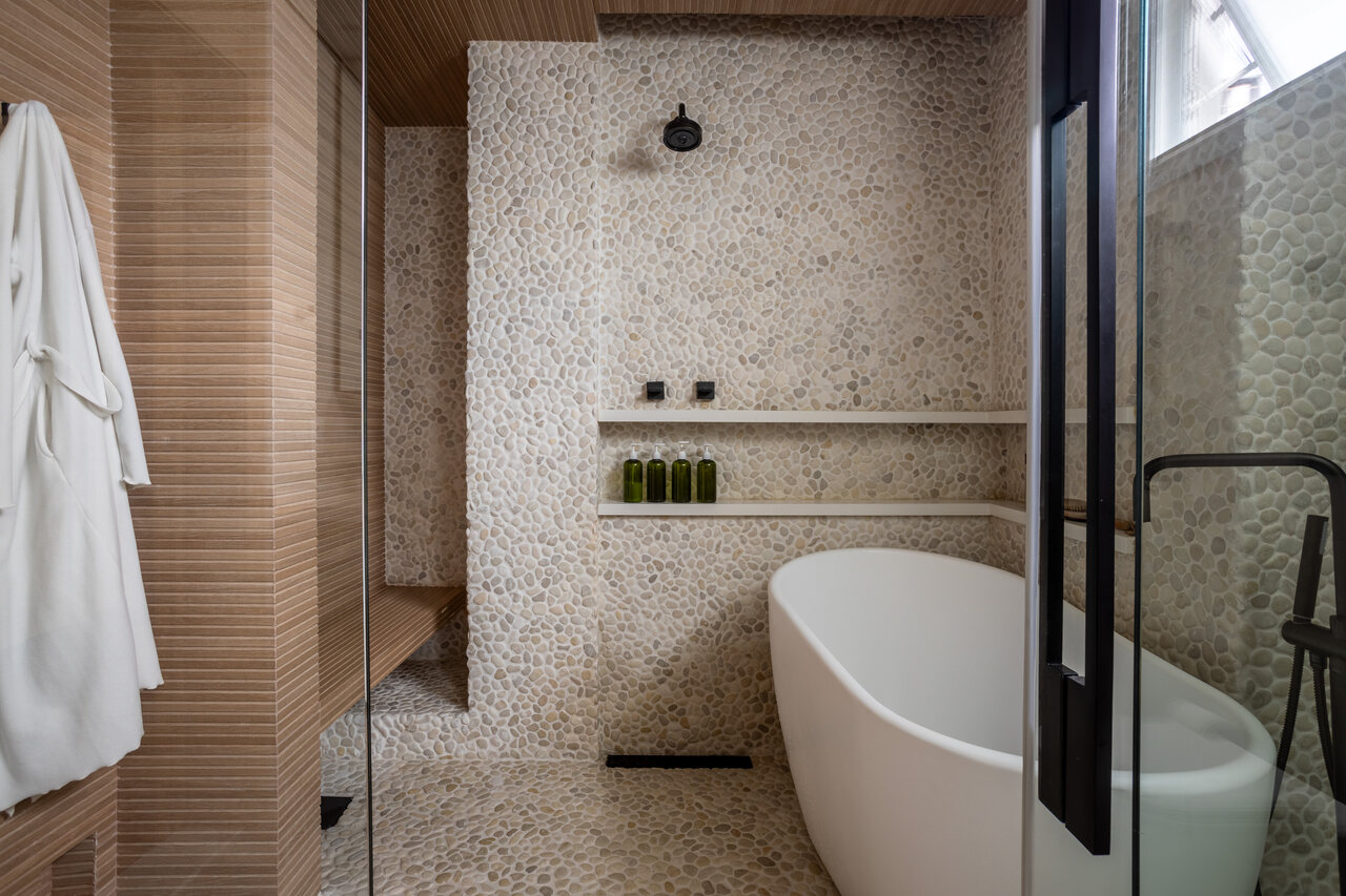 Entre os destaques está o uso de materiais naturais e tons claros, que imprimem leveza e sofisticação. O piso Donata aparece no hall, na sala de jantar e no lavabo. Já a parede de pedra moledo na sala reforça a elegância com um toque rústico. Além disso, o banheiro master ganhou atmosfera de spa, com sauna, ducha, banheira e revestimento em seixos, o que reforça o caráter exclusivo da reforma.