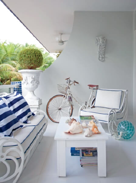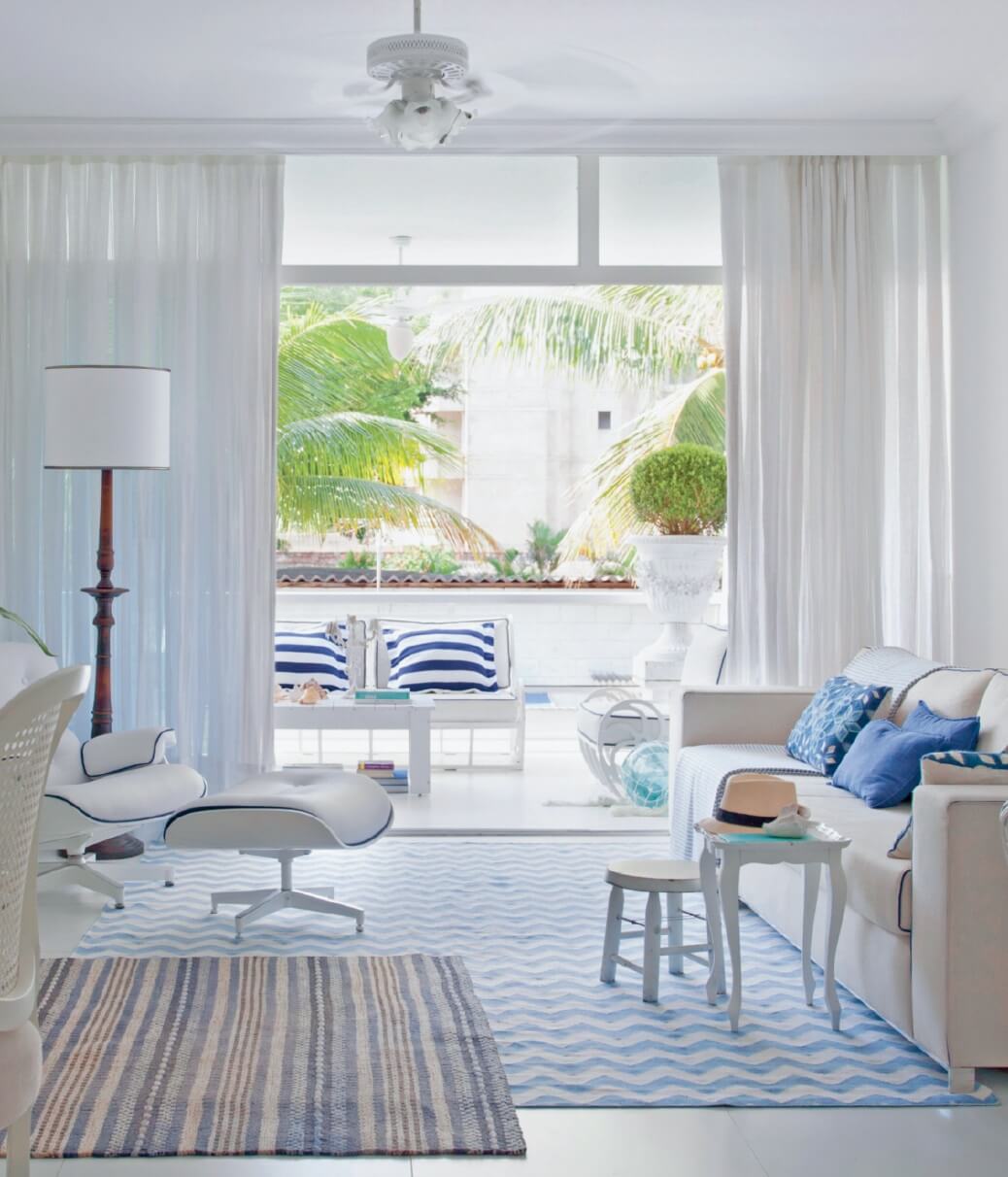 Iluminado e leve – como todo espaço de veraneio deve ser – o apartamento ganhou assim um décor na imbatível combinação do azul com o branco, e que une mobiliário clássico a outras peças que, garimpadas de viagens dos moradores, trazem um peso histórico.