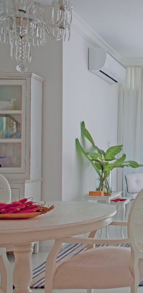 “Destaque para os pendentes dos quartos, vindos do Marrocos, e a escultura de sereia da suíte do casal. Cada canto da casa tem algo literalmente trazido de memória da família”, aponta Akl, que se especializou em design na escola Parsons de Nova York. “Tudo ali foi arrematado com peças aconchegantes e também de design importante, como a Lounge Chair de Charles Eames”, ele completa. Sem esquecer de falar do indispensável: “Em uma casa de veraneio, é fundamental pensar nos condicionadores de ar. Por isso, todos os ambientes desse apartamento podem ser refrigerados, inclusive a varanda!”. A lareira aparece para aquecer os dias mais frios.