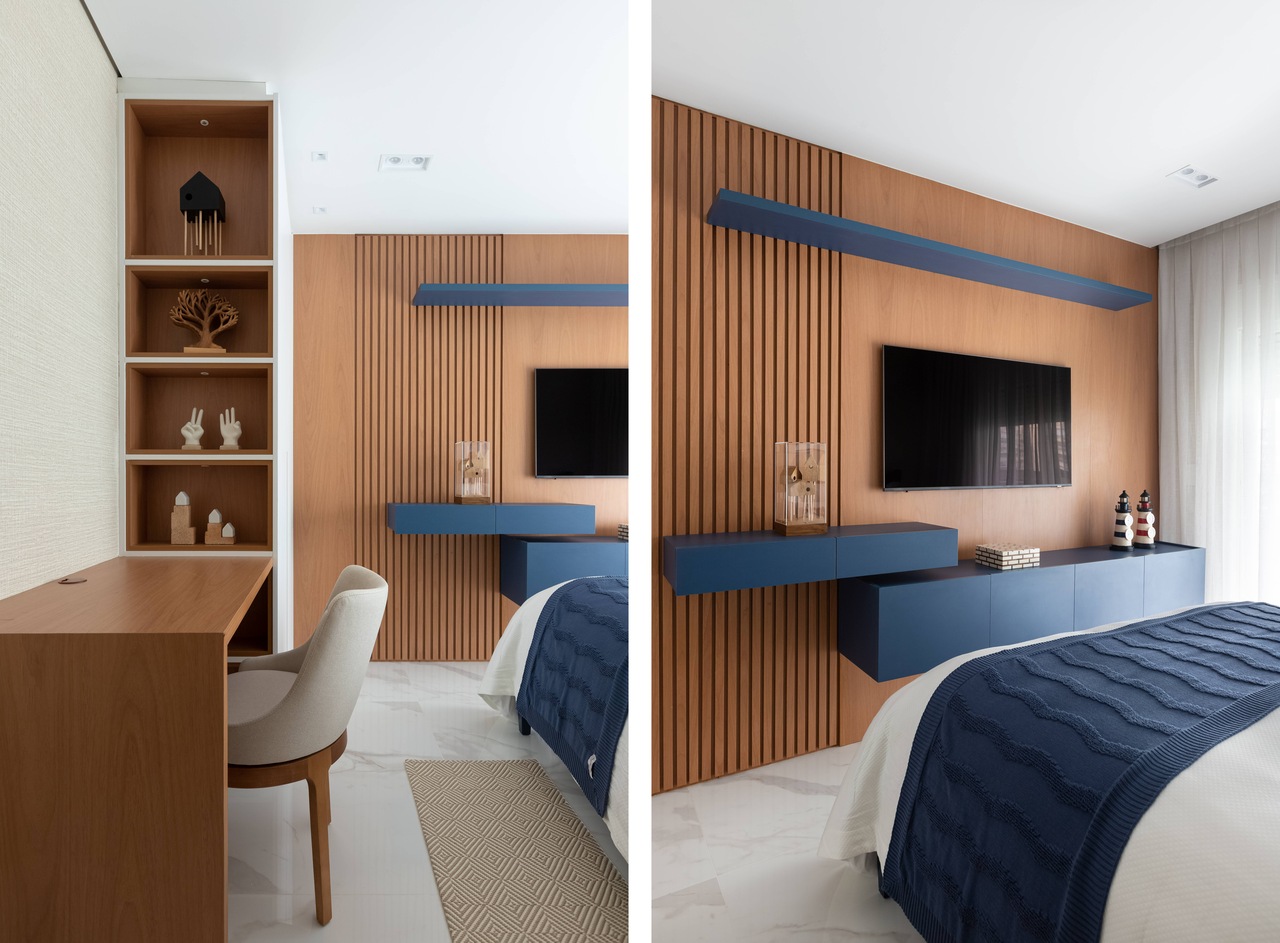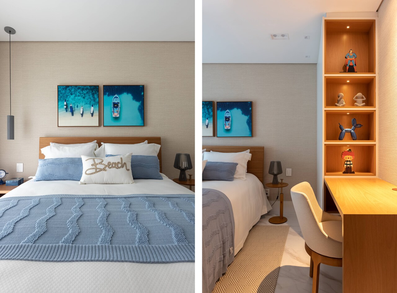 Para Daniela, uma casa de praia deve oferecer ainda mais conforto do que a residência principal, proporcionando uma experiência de descanso e bem-estar. Com essa premissa, o apartamento foi projetado como um verdadeiro refúgio à beira-mar, ideal para momentos de relaxamento e celebração.