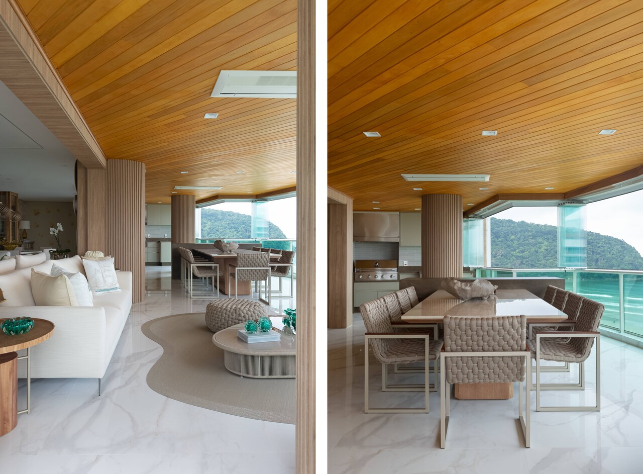 uma conexão constante com a paisagem. A base neutra dos acabamentos e mobiliários confere elegância, permitindo que a luz natural e a brisa do mar complementem a atmosfera de tranquilidade