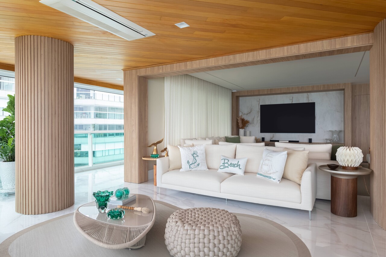 Com paleta de cores neutras, materiais nobres e design atemporal, apartamento no litoral de São Paulo foi pensado para proporcionar aconchego máximo e momentos inesquecíveis aos moradores