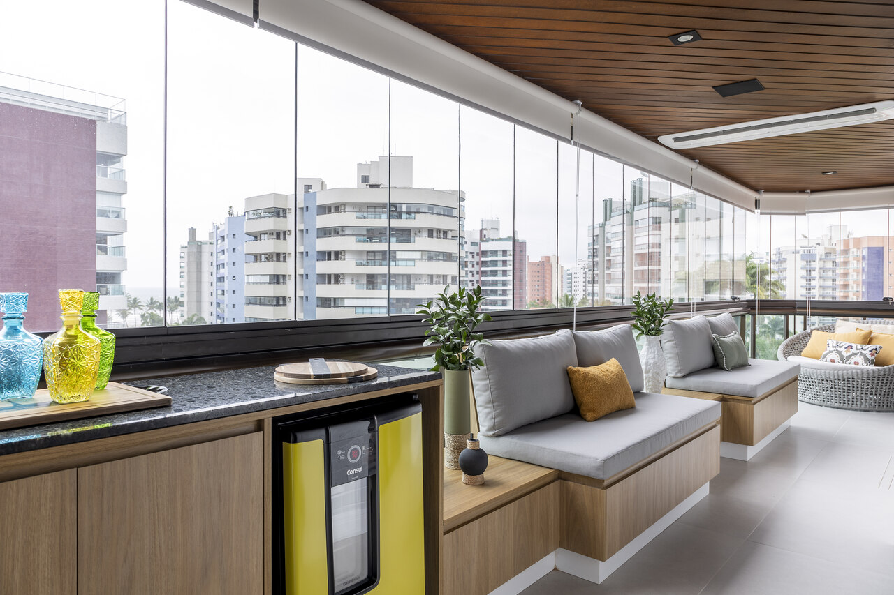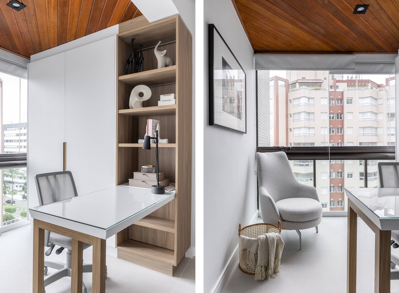 Outra intervenção estratégica foi a leve redução da parede do quarto da filha do casal, possibilitando a ampliação do home theater. Já a varanda foi integrada ao dormitório por meio de um fechamento em vidro, criando um espaço ideal para um escritório iluminado.