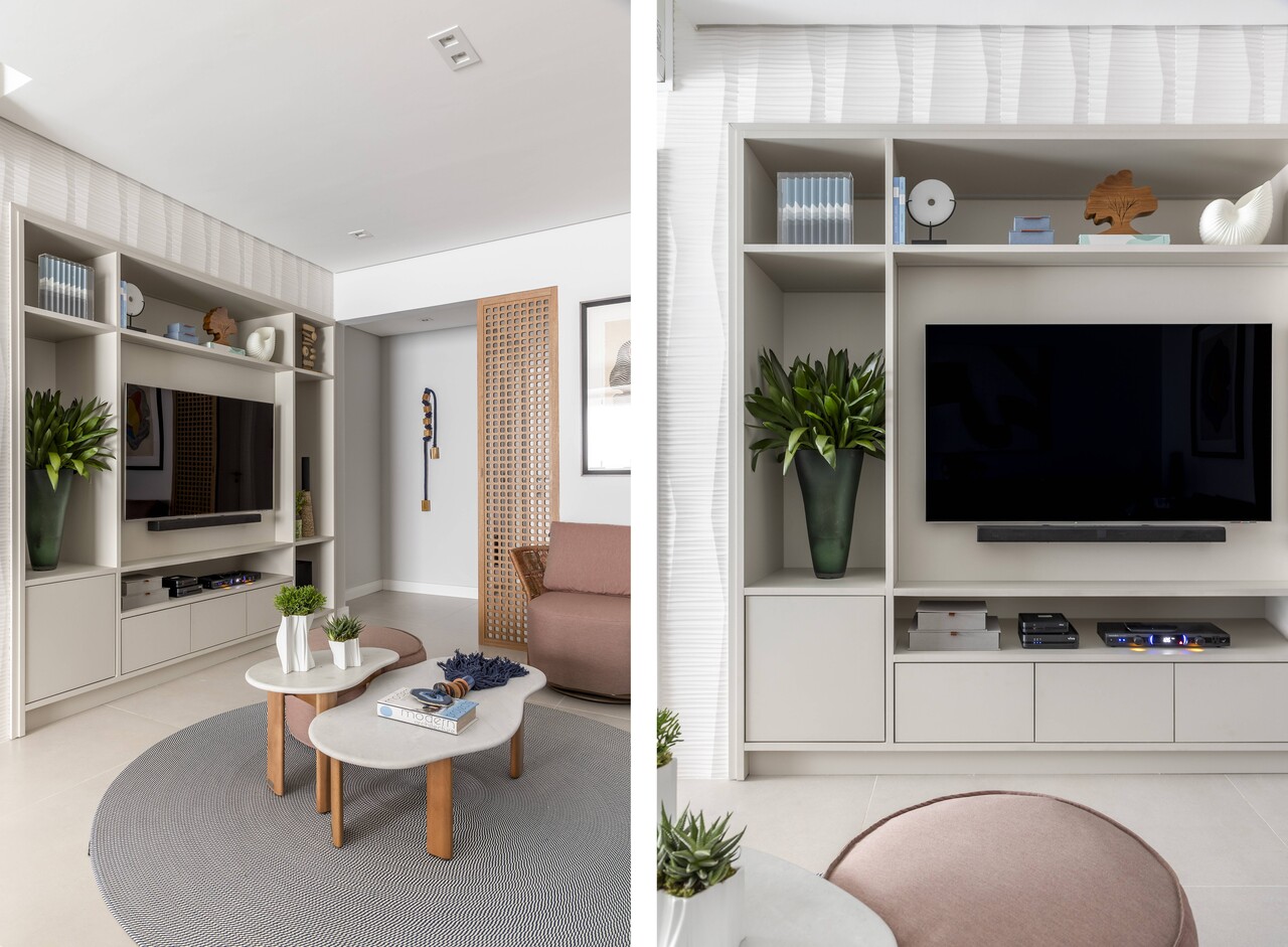 A marcenaria se tornou um dos elementos centrais do projeto. Desenvolvida em tons claros e combinada com detalhes em madeira freijó, ela reforça a linguagem contemporânea do apartamento e oferece soluções funcionais para o dia a dia.