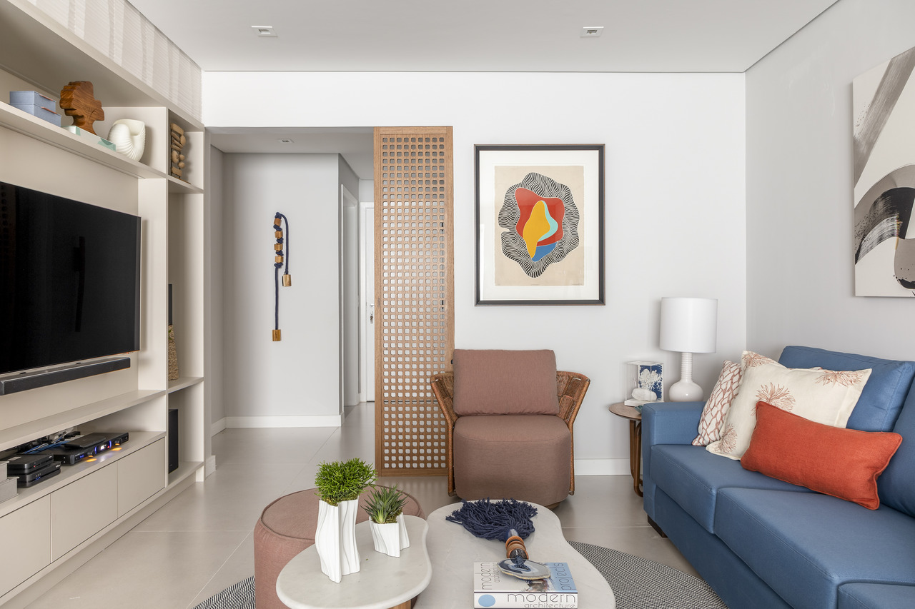 Apesar da transformação estética, a reforma respeitou a planta original do imóvel. A redistribuição dos ambientes ocorreu principalmente no layout do living, que foi reorganizado para melhorar a circulação e ampliar a área social.