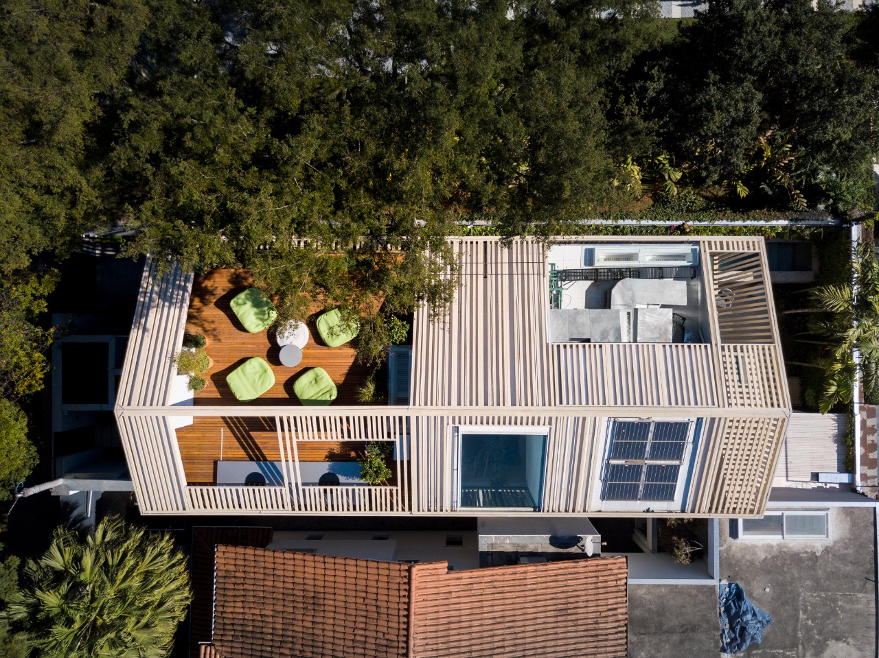 O rooftop tem poltronas verdes da Nani Chinelatto e mesa de centro da Casual Exteriores.