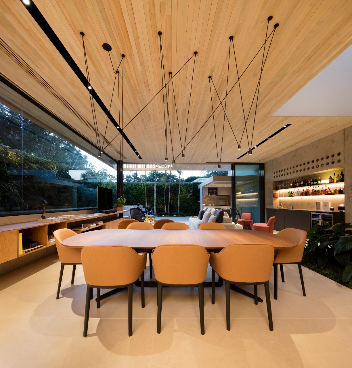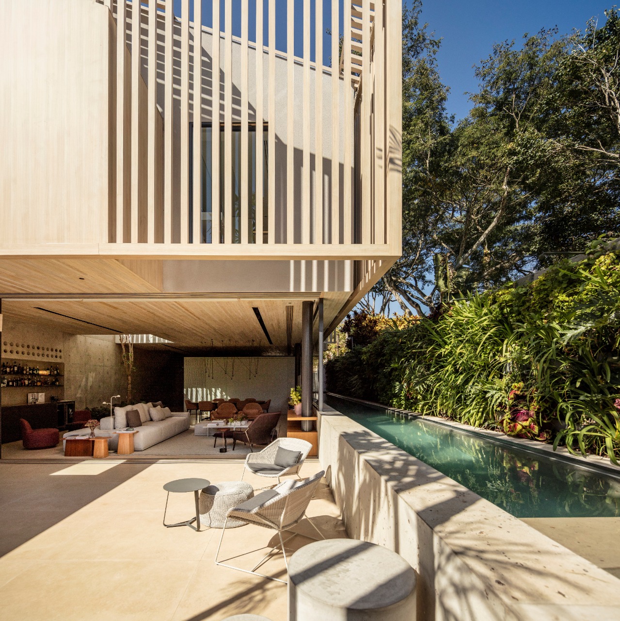 A piscina, que percorre o corredor lateral, é integrada com os interiores dos os ambientes do térreo. O verde invade a residência pelas árvores do lado externo e pelo jardim vertical instalado no muro.