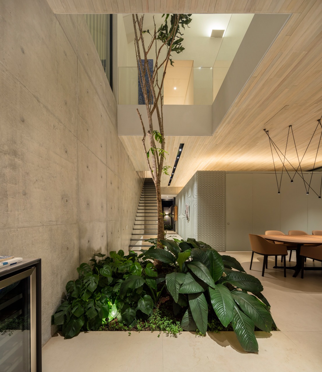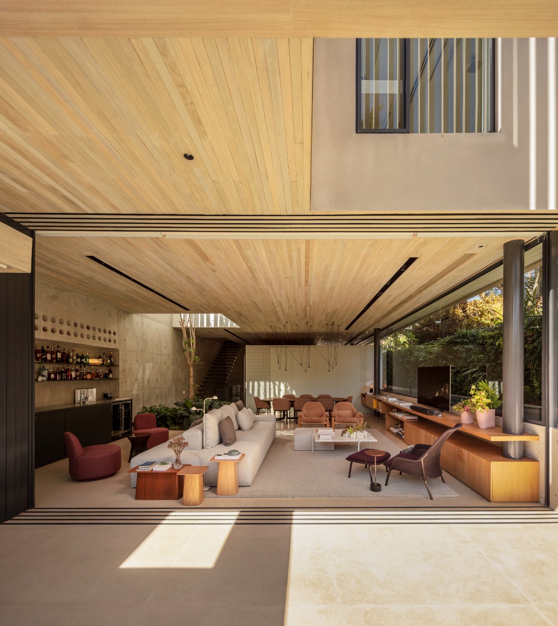 No térreo, encontra-se toda a área social, como o bar e as salas de estar e jantar, com interiores contemporâneos com móveis de design, como a mesa de jantar assinada por Jader Almeida e as poltronas na cor caramelo de Jorge Zalszupin. Uma empena lateral em concreto aparente, teve uma adega criada a partir da própria concretagem da parede, onde abriga o bar, que era um grande desejo dos moradores que recebem visitas com frequência. A cozinha fica maior na parte do tempo integrada e, em dias de eventos, pode ser isolada por portas camarão que correm por um trilho.