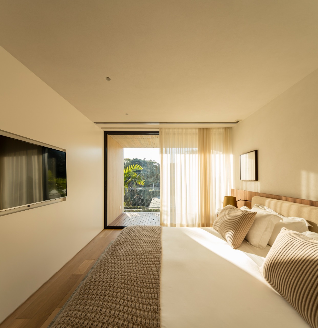 Na suíte do casal os tons claros trazem a sensação de conforto junto do piso em carvalho bianco da Indusparquet.