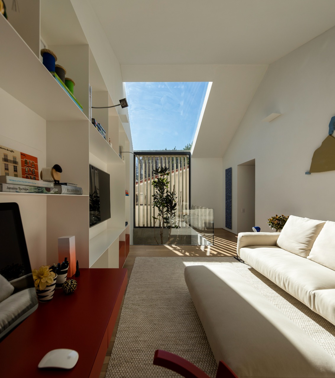 Na sala de tv, que também funciona como home office, ganha destaque a partir da marcenaria que recebeu a cor vermelha.