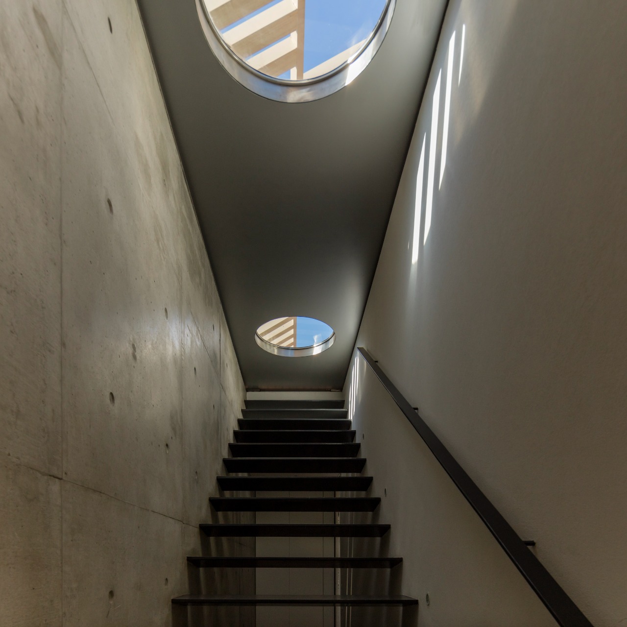 Escada de acesso ao rooftop. Na abertura de acesso a cobertura, aberturas permitem a entrada da luz natural.