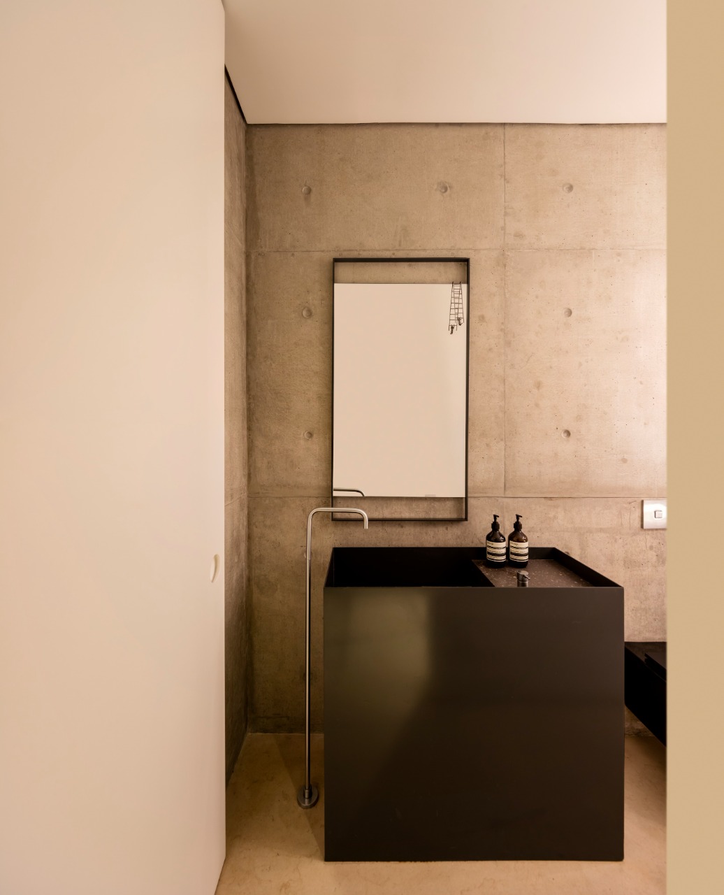 O lavabo tem características minimalistas e industriais.