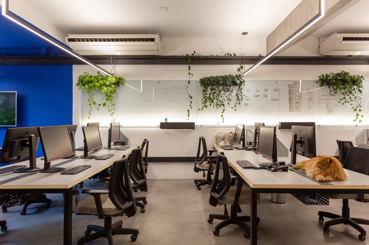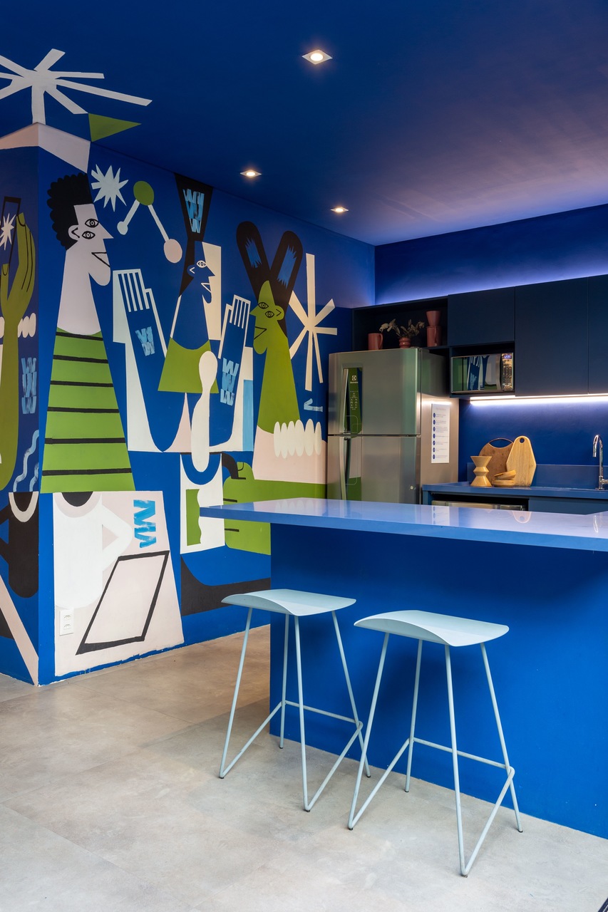 Um dos destaques foi criado pelo premiado artista Rômolo D’hipólito, que pintou murais com personagens que fazem parte da identidade visual da agência, com o fundo azul bic, que transporta a identidade visual da agência para as paredes do escritório. Além disso, os três gatos persas, Mutante, Yoda e Checho, que “trabalham” e moram na Abby coroam a vibe descontraída do ambiente.