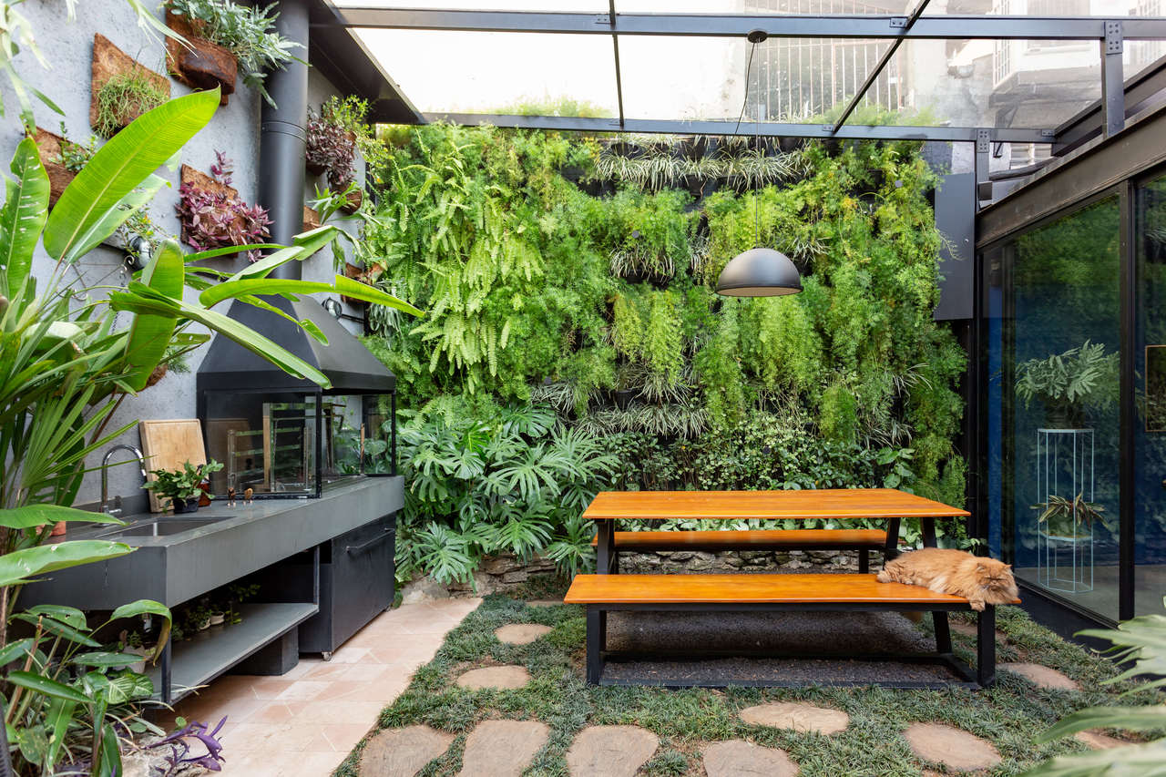 Na área do jardim, um espaço descontraído para interação dos funcionários da agência.