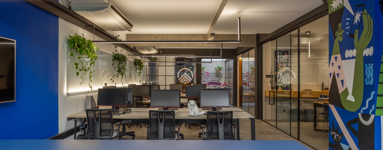 O espaço ocupa 160m² com área de convivência, cozinha integrada, bancadas de trabalho espaçosas e muito vidro, para o aproveitamento da luz natural, derivada do jardim, que é o ponto alto da casa e que o time desfruta para trabalhar ao ar livre ou confraternizar em happy hours.