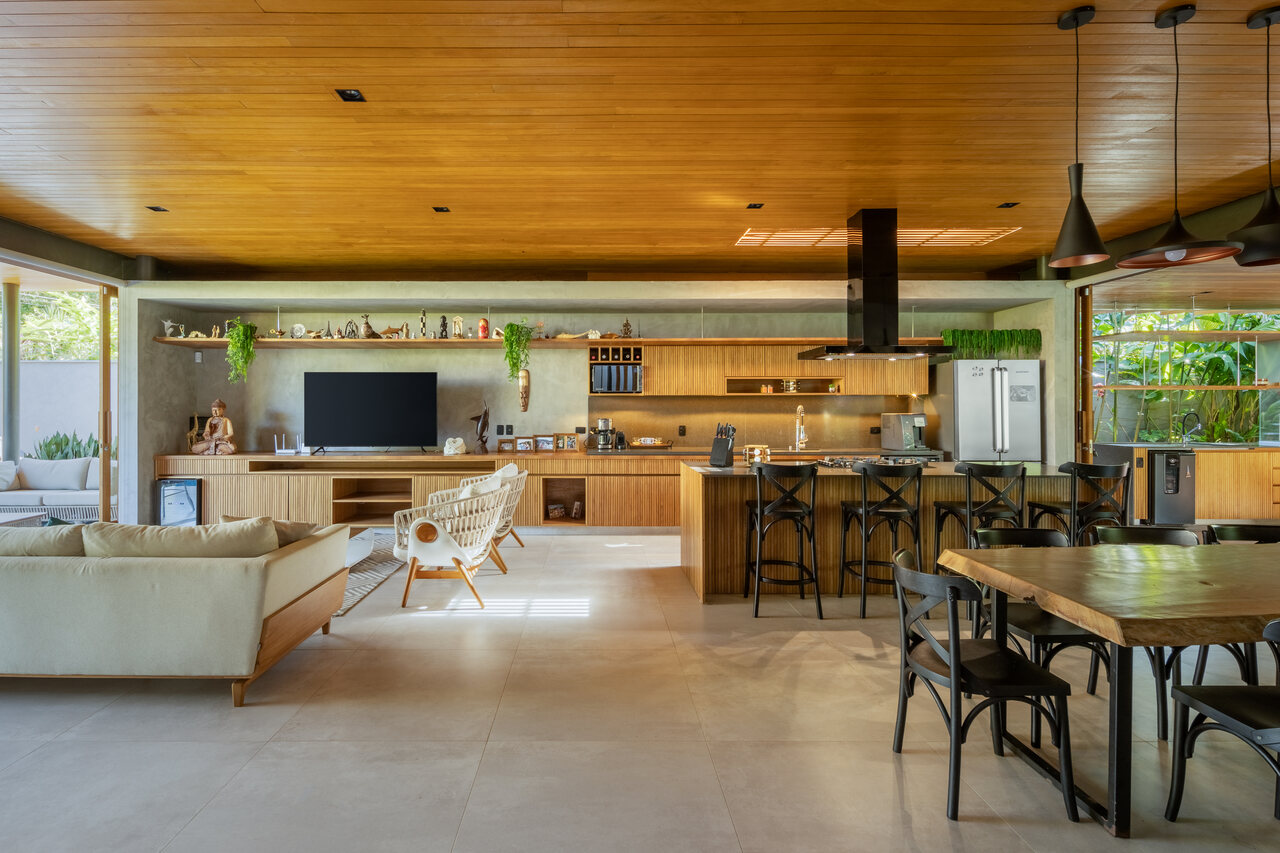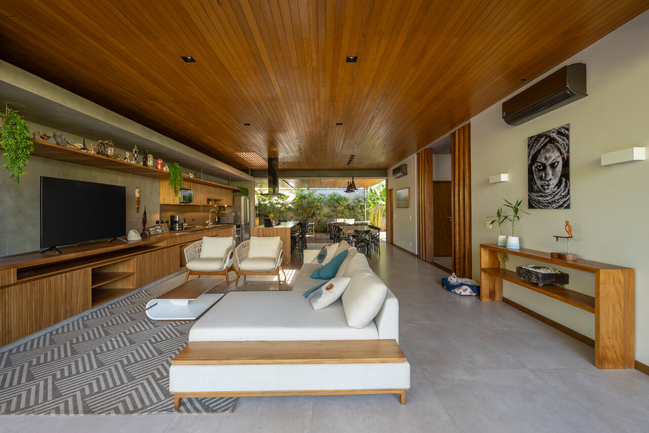 A área social foi projetada com transparência total entre a frente e o fundo do lote, permitindo a livre circulação de ar e luz. Um dos destaques é a cobertura com beirais chanfrados, que suaviza as linhas da construção, confere leveza visual e reforça a proteção solar.