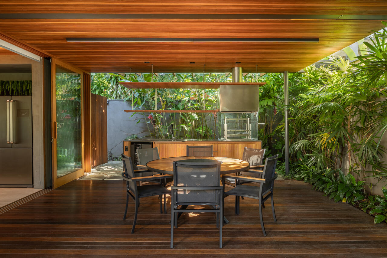 Desde o início, o objetivo foi criar uma residência que respondesse às altas temperaturas da região. Madeira, vidro e grandes aberturas aparecem como protagonistas, promovendo ventilação cruzada, iluminação natural abundante e uma relação contínua entre interior e exterior.