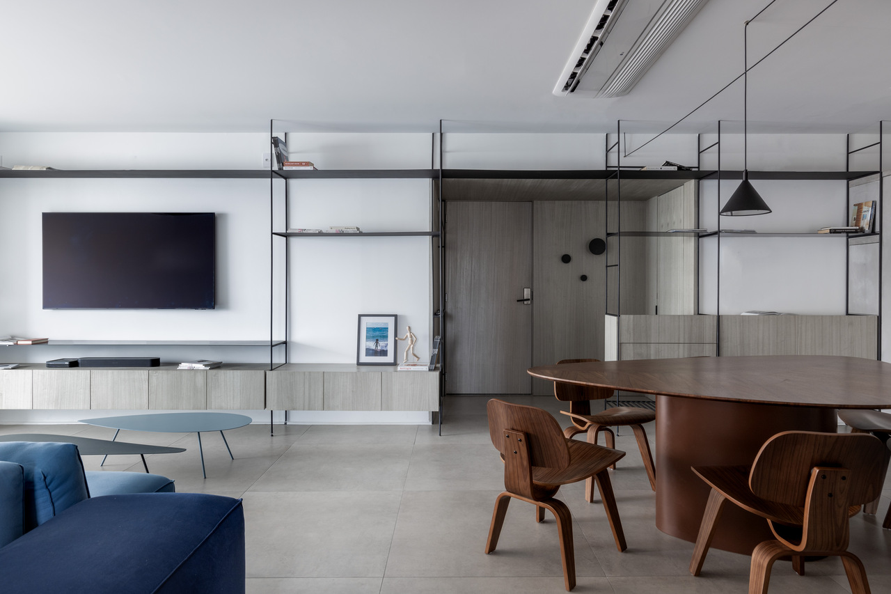 A estante modular multifuncional em serralheria percorre todo o apartamento, funcionando como um elemento decorativo e integrando o home theater, os aparadores do hall de entrada e da sala de jantar, além de um bar projetado para ocasiões especiais. Outro dos elementos de destaque, que marcam a transição entre os espaços, é o pilar e a viga em concreto aparente.