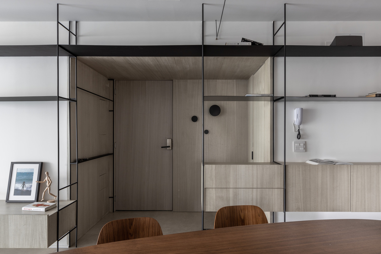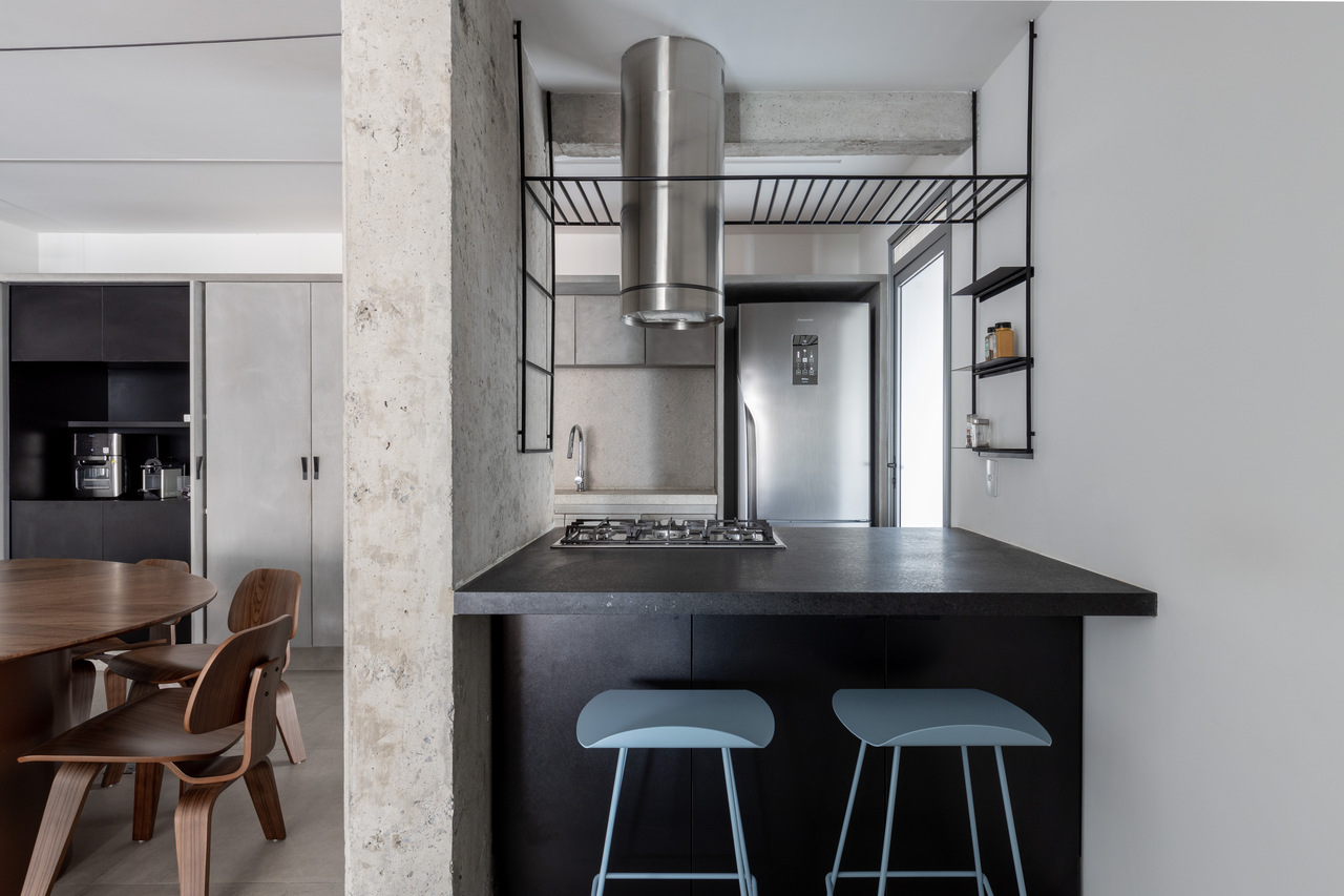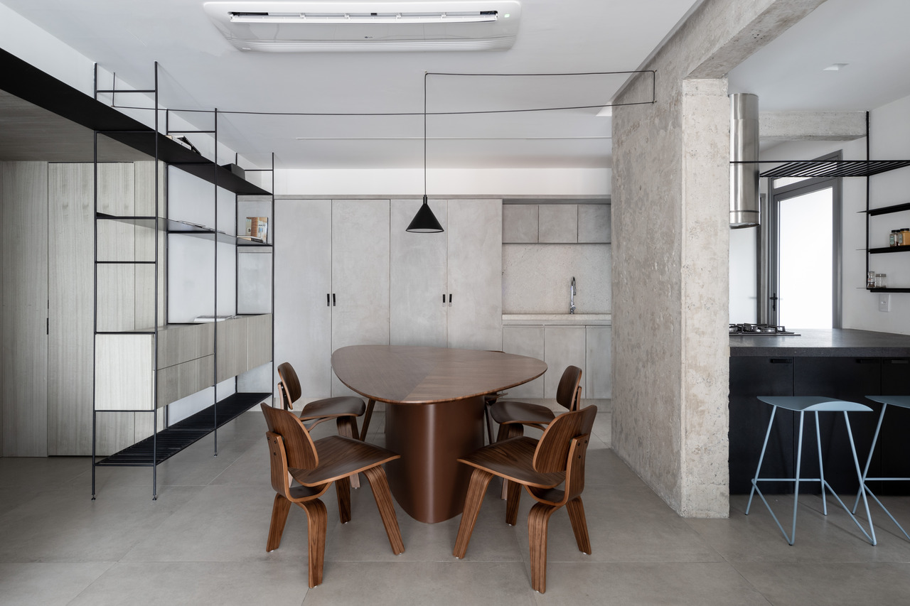 A estante modular multifuncional em serralheria percorre todo o apartamento, funcionando como um elemento decorativo e integrando o home theater, os aparadores do hall de entrada e da sala de jantar, além de um bar projetado para ocasiões especiais. Outro dos elementos de destaque, que marcam a transição entre os espaços, é o pilar e a viga em concreto aparente.