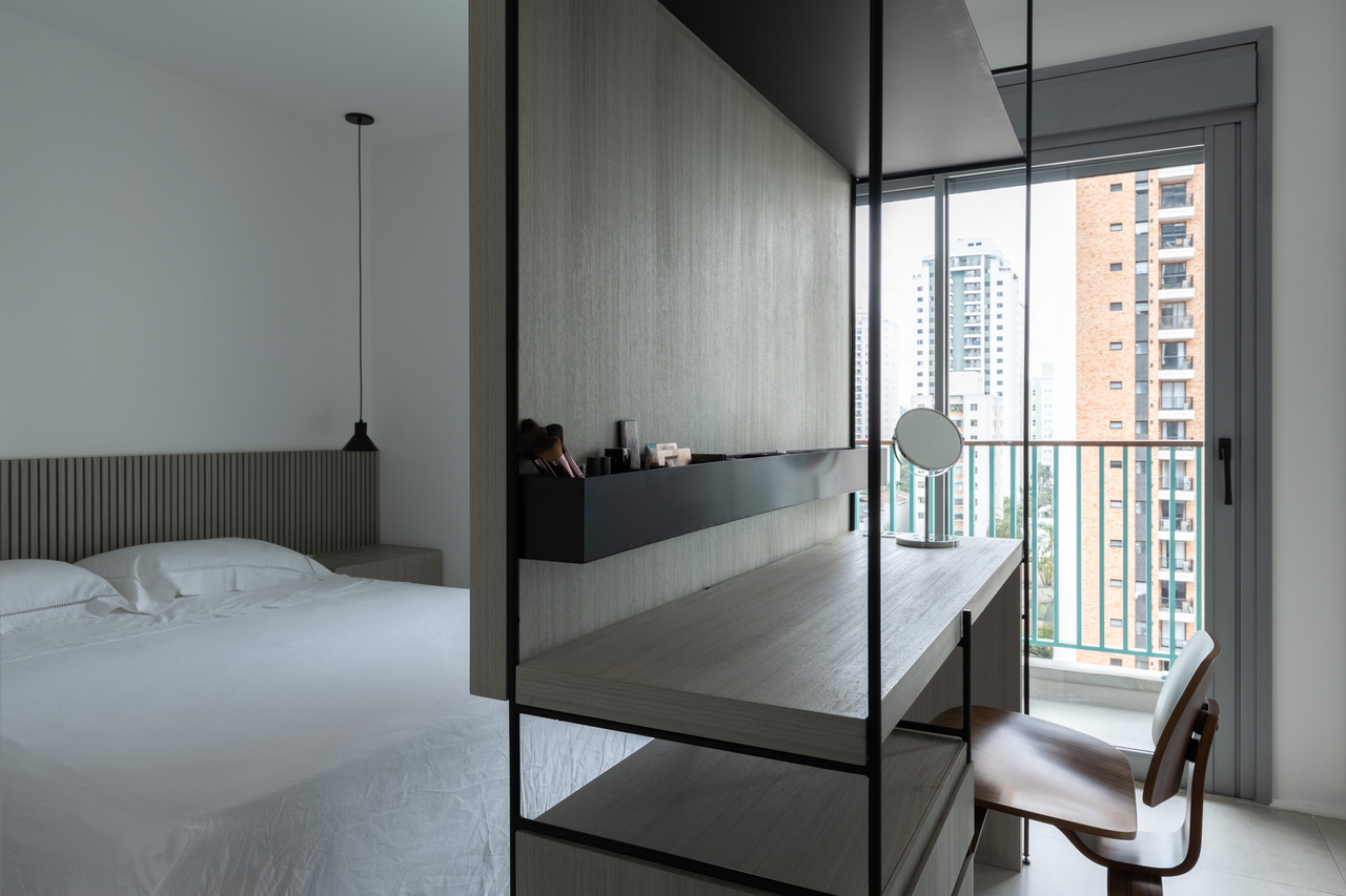 Tons de cinza e serralheria inteligente coroam apartamento atemporal em Moema