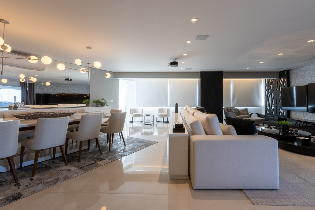 O apartamento ganhou cores mais escuras com tons de cinza, preto e um toque em metal, um pedido dos clientes, e tem a área social privilegiada para que o casal receba amigos e familiares. Na parte estrutural, houve remoção de paredes para integrar e ampliar ambientes, como na suíte do casal e na varanda gourmet.