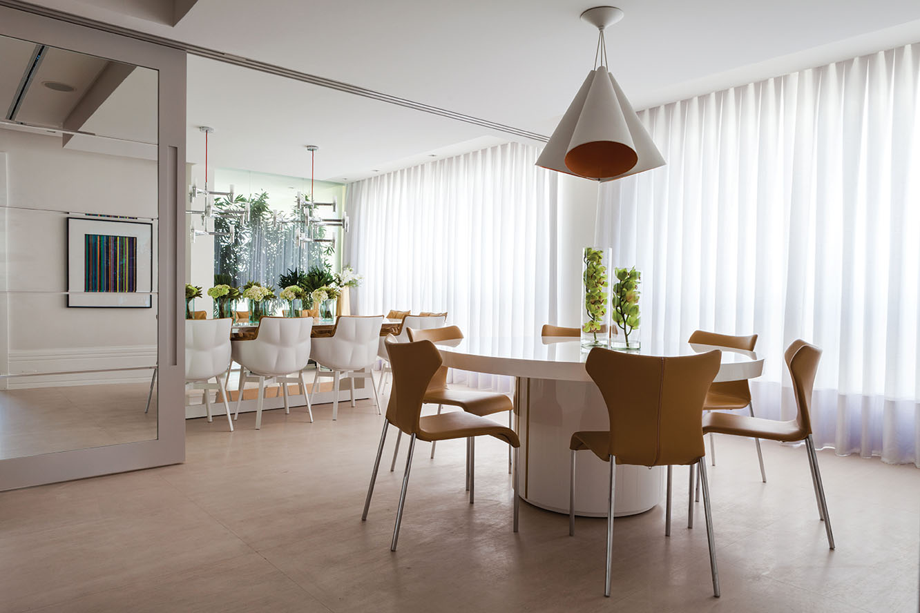 O projeto seguiu uma linha sóbria quando se pensa em revestimentos – com silestone no piso e tinta na parede – e as grandes janelas, que propiciam muita luz solar, garantiram mais claridade e aconchego, exatamente como o desejado. Nas áreas comuns, os espaços integrados são perfeitos para receber bem, mas ainda contaram com uma solução inteligente e que propicia privacidade quando desejado – a sala de almoço pode ser unida com a de jantar, para abrigar vários convidados, mas quando a família está sozinha, uma porta de correr de espelho tem a capacidade de segregá-las, dividindo o salão em dois. “Se a casa estiver cheia de convidados, a porta de espelho se abre e todos podem se acomodar em ambas mesas e ficarem próximos”, explicam os profissionais, que também se preocuparam muito com a funcionalidade de cada ambiente.