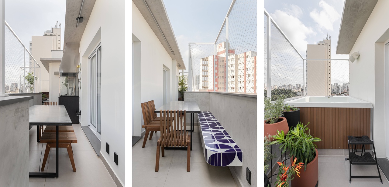 A varanda da cobertura percorre todos os ambientes do apartamento, criando uma sensação de casa. Portas balcão conectam os quartos e a sala à varanda e permitem que os moradores desfrutem do sol, do céu e da vista para o parque. Plantas frutíferas, como limão siciliano, morango, amora e jabuticaba, além de uma variedade de temperos, complementam o espaço e levam aromas relaxantes para os interiores da morada.