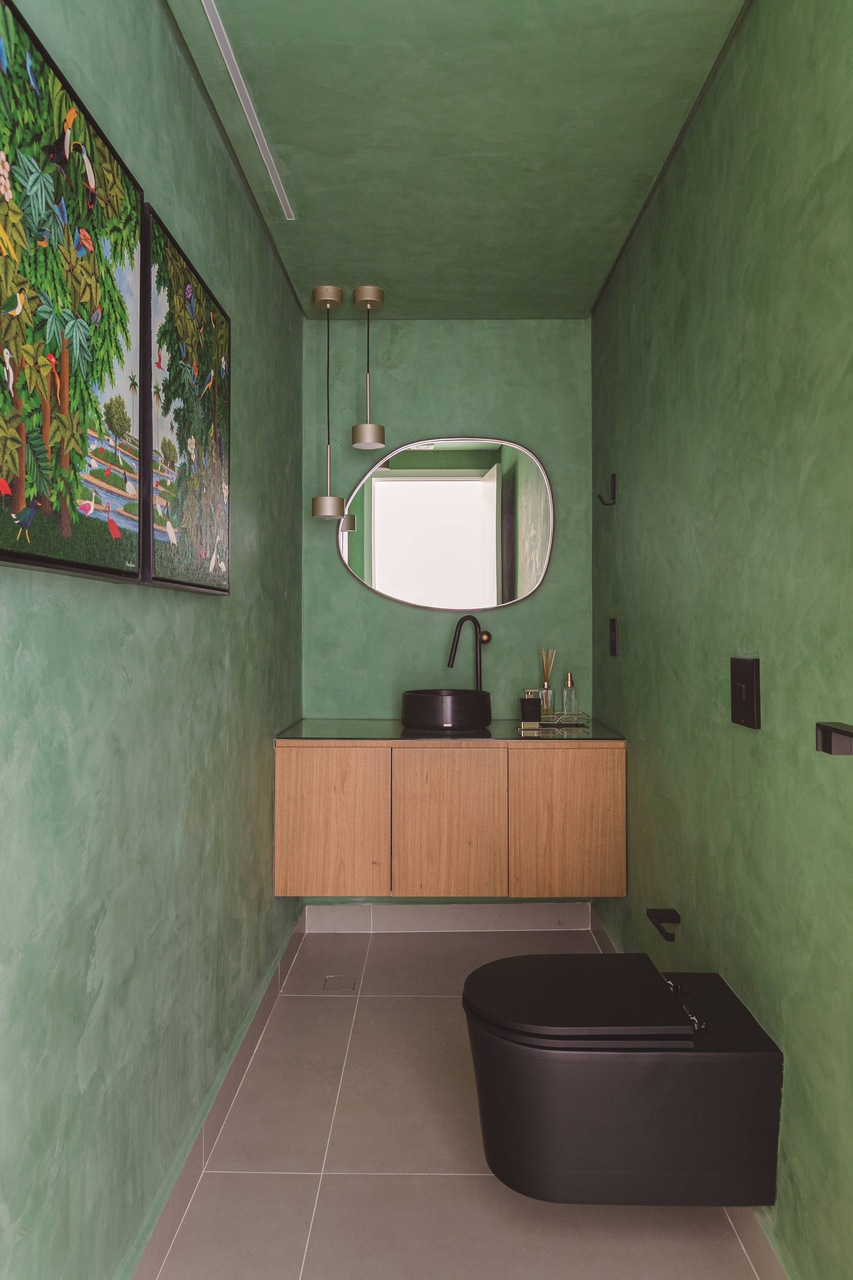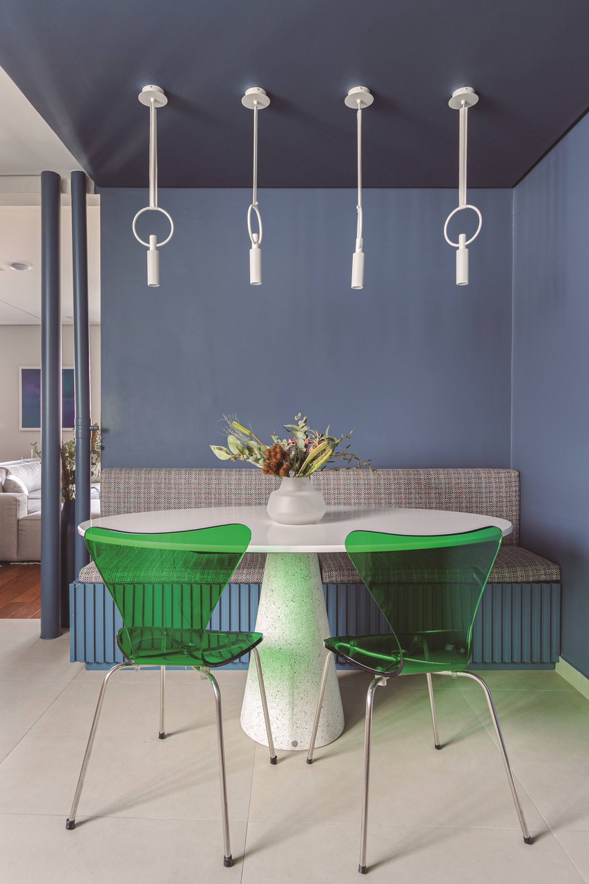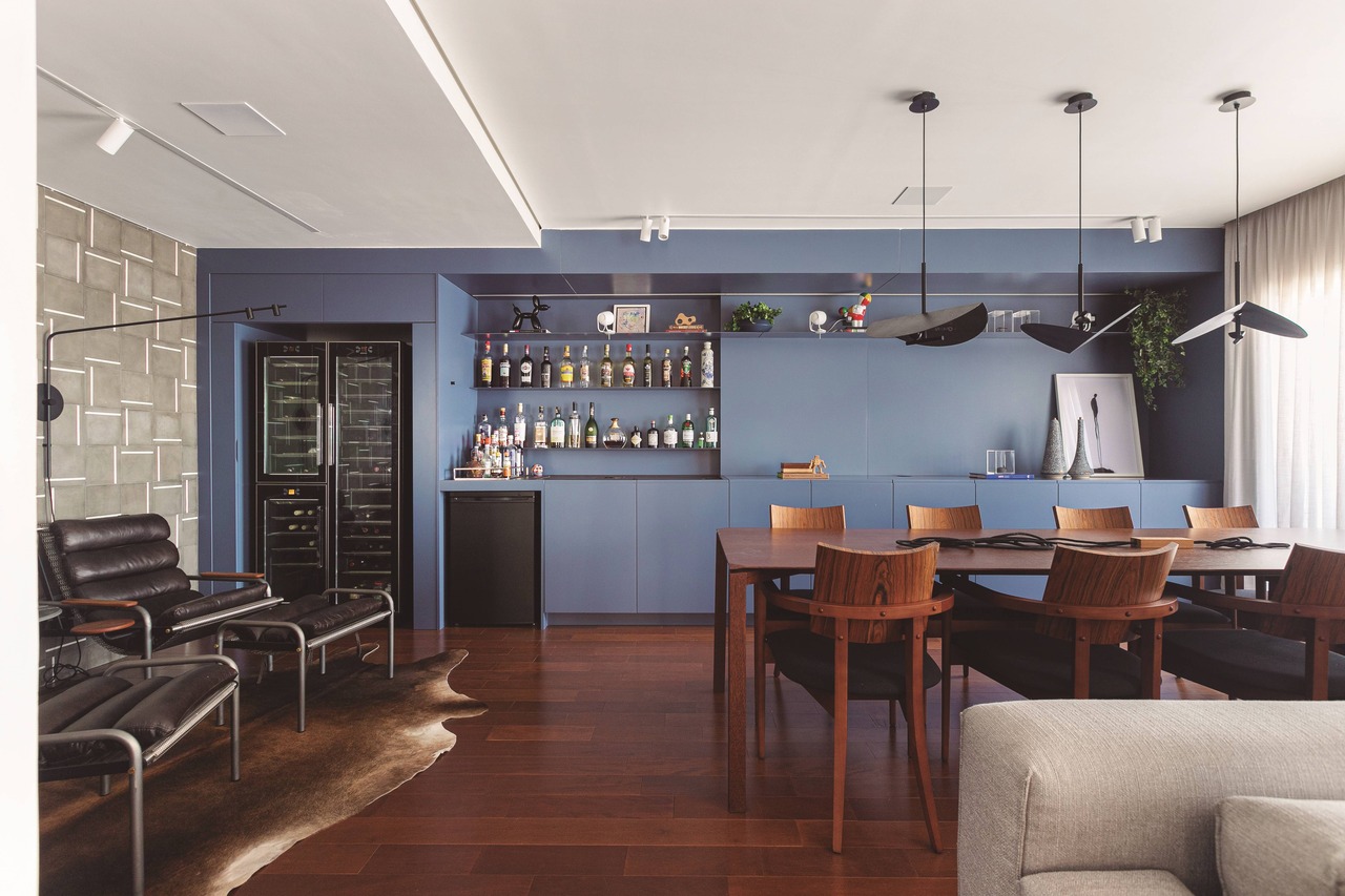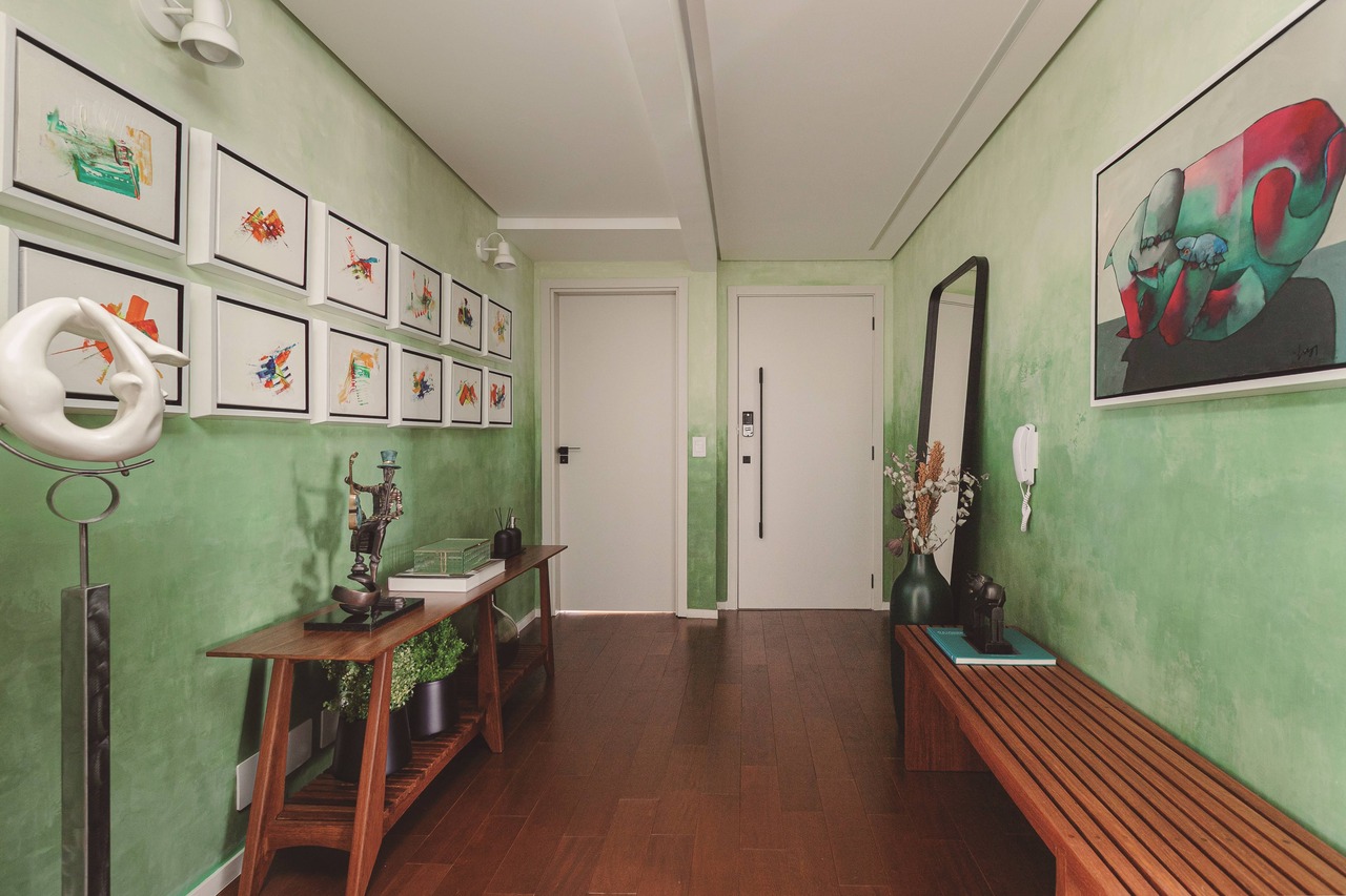 A arquiteta optou por uma base sóbria e neutra, que permeia todos os ambientes, para garantir o visual limpo e sofisticado. O azul, na área do bar e da cozinha, e o verde, no hall e lavabo, adicionam vitalidade sem comprometer a sensação atemporal. A escolha cuidadosa de trabalhar com cores análogas em vez de cores complementares criou um equilíbrio suave e acolhedor.