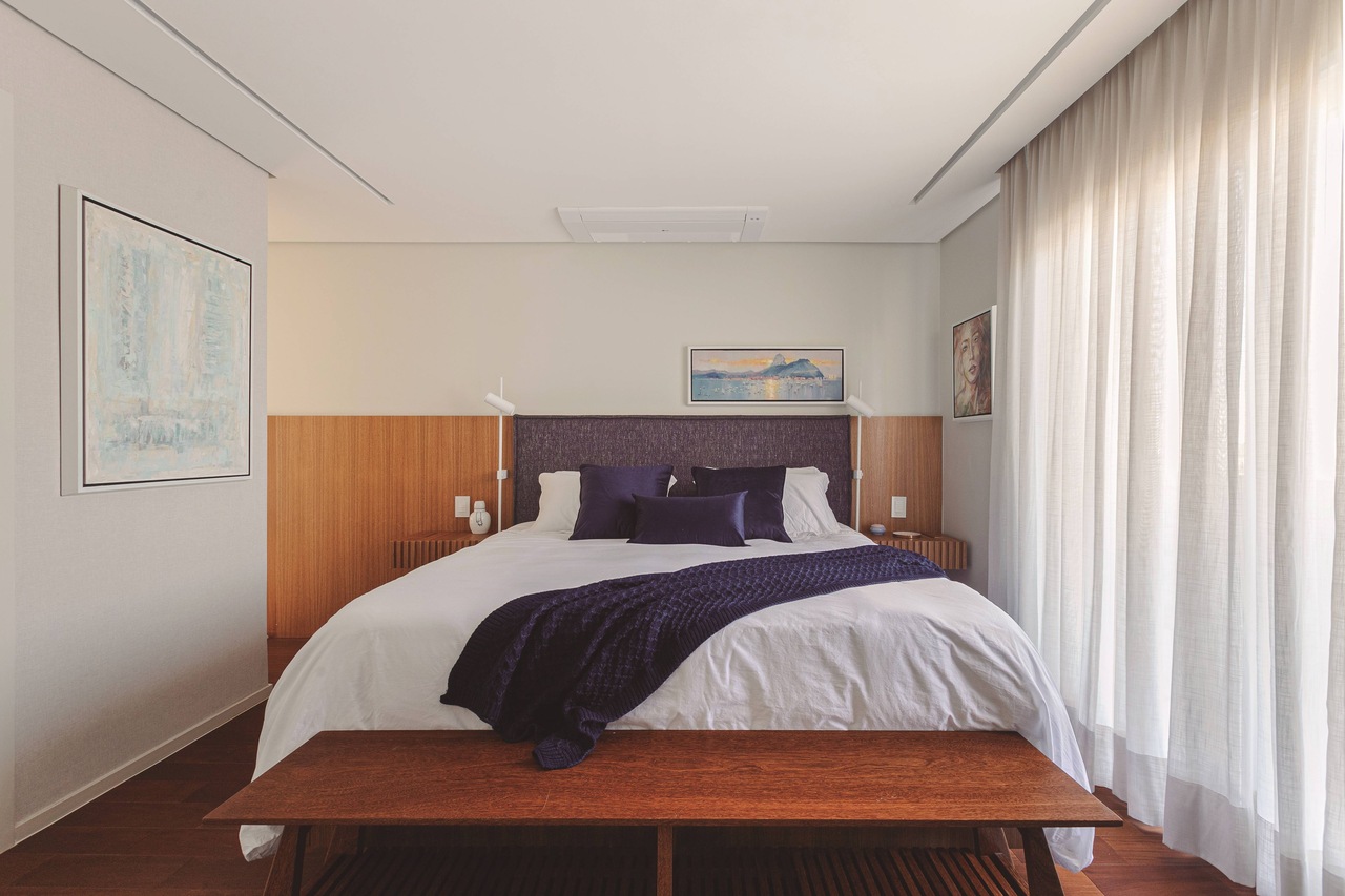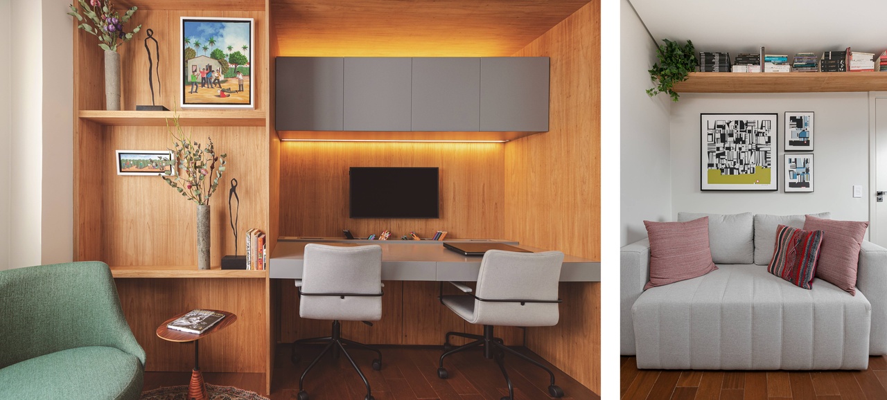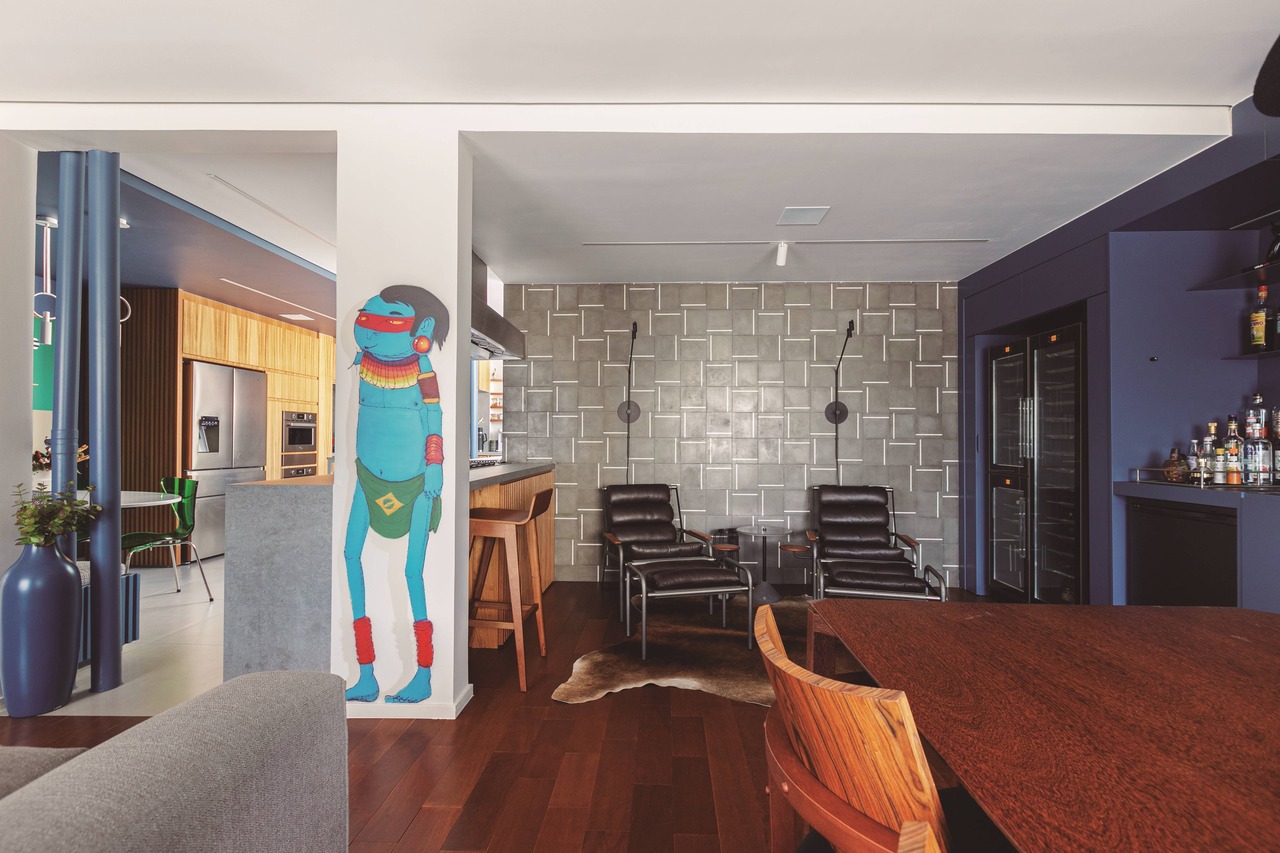 O design e a arte brasileira são protagonistas na decoração e valorizam a cultura nacional. Cada peça foi escolhida com cuidado, em busca de harmonizar forma, função e estilo. Entre os destaques, estão as poltronas do bar que trazem um toque de modernidade e ousadia; sofá, mesa e cadeiras de jantar combinam conforto e qualida de; o aparador, banco do hall de entrada e o banco do quarto imprimem identidade para o projeto. Obras de arte completam o estilo da decoração, com pinturas e esculturas.