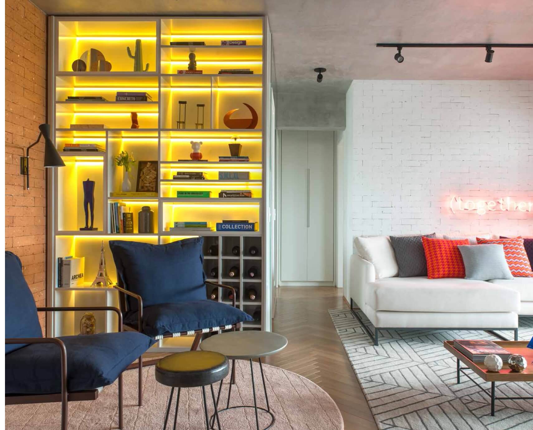 A iluminação de LED embutida em cada nicho da estante traz aconchego ao ambiente e auxilia na busca pelos livros.