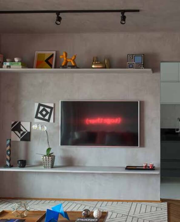 A escolha dos móveis foi pensada para criar contraste com a decoração leve, como é possível observar na mesa de jantar, que tem base em concreto e tampo de madeira, mas é cercada pelo design delicado das cadeiras de corda. O projeto jovem e atemporal traduz a personalidade dos moradores. A sala de estar é o destaque do apartamento, graças a estante iluminada e o discreto cantinho de leitura, composto por poltronas (colocar modelo, assinatura do design e loja) e delimitado pelas plaquetas de tijolo sem acabamento. Logo ao lado, na sala de TV, a parede revestida com tijolos pintados de branco torna o ambiente mais leve. Na área do home theater, o acabamento em cimento aparente destaca a TV, embutida na parede. Fugindo da marcenaria tradicional, o cimento queimado é protagonista