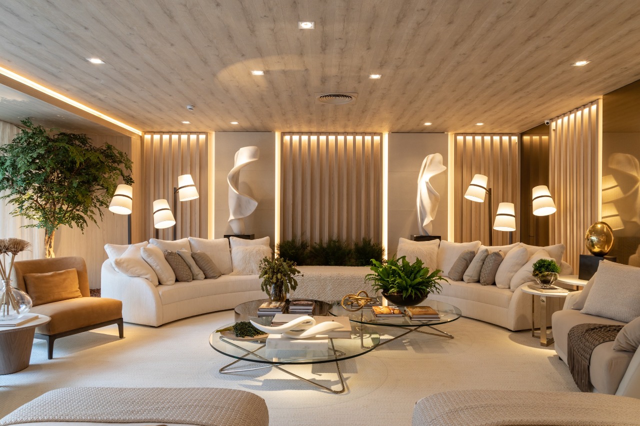 Tons como bege, branco e palha são os mais utilizados aos adeptos do estilo clássico. Em contraste, o amadeirado pode entrar como protagonista do ambiente. No projeto da arquiteta Angela Russi, o MDF Freijó, da Guararapes, reveste todas as paredes e agrega sensação de conforto e bem-estar ao espaço.