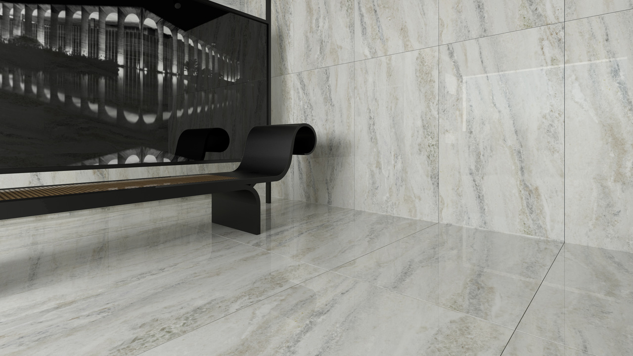 Já a linha Ravello será comercializada apenas no formato 80,5 x 140cm e é uma ótima opção para ambientes internos com baixo tráfego. Sua inspiração vem do edifício icônico, o Auditório Niemeyer, que destaca uma parte da arquitetura moderna encravada na beleza medieval da cidade que dá nome à linha, Ravello, na costa Amalfitana, da Itália. É uma obra impressionante, marcada por um elemento branco em formato de uma enorme caixa acústica, debruçado em um precipício junto ao mar, aberto pela transparência dos grandes vitrais instalados nas fachadas frontal e lateral. É uma integração do antigo com o novo, do natural com construído. Todo cenário resultou em peças ímpares compostas por um mármore branco polido, claro e puro com nuances azuis, que remetem à paisagem composta pela obra arquitetônica e as águas italianas.